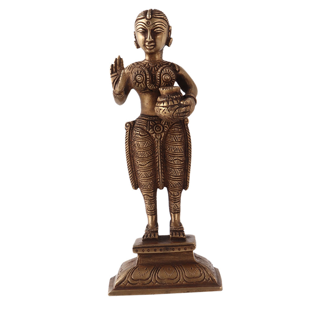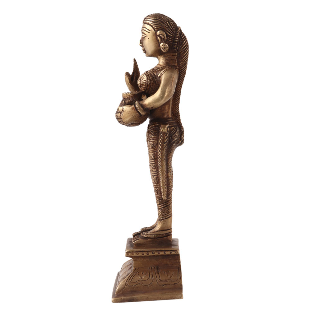 Brass sculpture of a standing lady holding a water pot in her left hand. This statue was made of high quality brass using ancient techniques with intricate details. A wonderful piece to decorate on a table, shelf or altar. Display the statue in your living room and it will be an eye catcher for your guests. A beautiful rustic looking piece for your vintage collection. Ideal for collections, decorations and individual gifts for all special and festive occasions.
