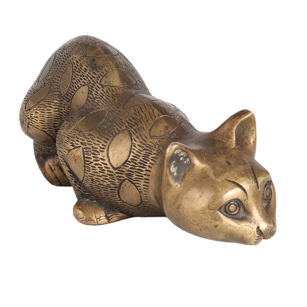 A brass statue of a cat in an attacking position. Buy a handmade cat statue online, handcrafted by highly skilled and experienced artisans using ancient methods. This statue depicts a cat with stiffened rear legs, with the rear end raised and the back sloping down towards the head and tail is stiff and lowered to the ground. This statue is handcrafted by skilled Indian artisans and will leave a long lasting impression in your home decor. Decorate your home with a statue crafted from high quality brass that will add an alluring look to the interiors of your home or office. A perfect item to gift on special, festive or auspicious occasions to your family, friends or relatives.