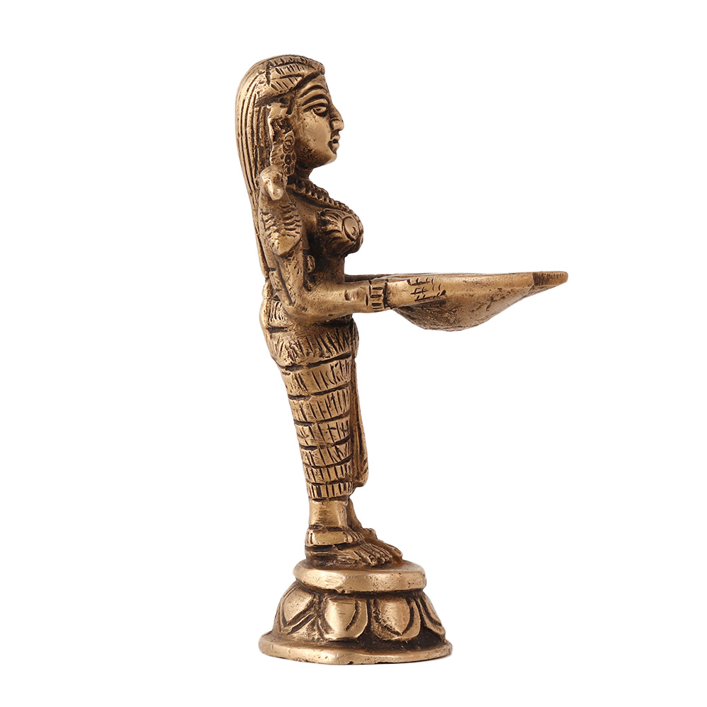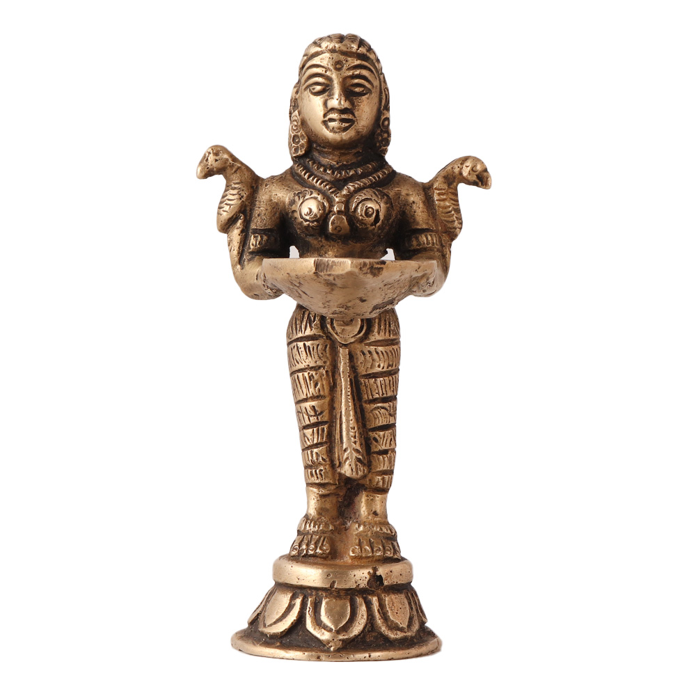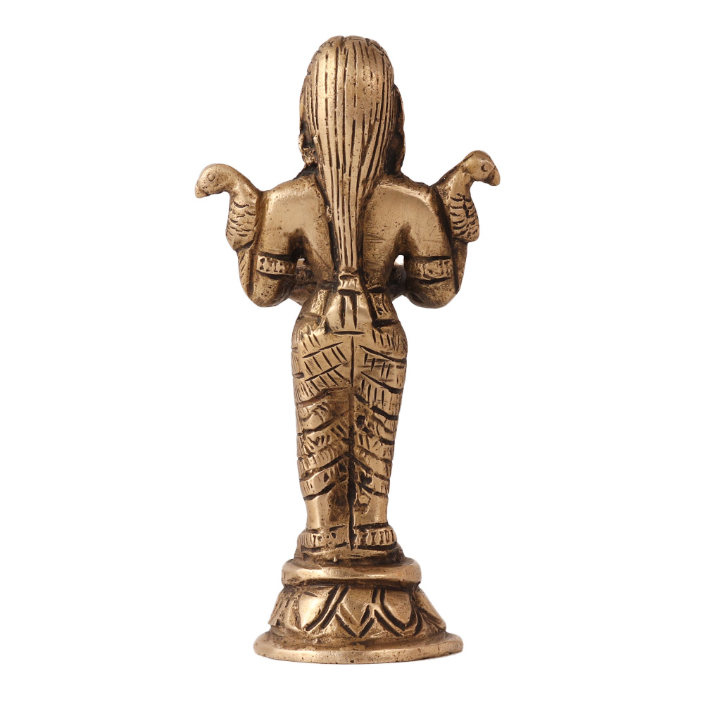 The Deepakshmi metal statue holding a diya and parrots on her shoulders is a beautiful representation of the Hindu goddess of wealth and prosperity, also known as Lakshmi. The statue décor typically depicts Lakshmi standing with a diya (oil lamp) in one hand and two parrots on her shoulders, symbolizing happiness and good luck. The intricate details and precise craftsmanship of the indian figurine make it a work of art, and its golden color gives it a rich, regal appearance. The statue is not only a beautiful piece of decor, but it is also a symbol of hope, abundance, and prosperity for those who believe in the Hindu religion. The statue is often placed in homes, temples, and places of worship to evoke blessings and peace. Devotees believe that displaying this statue in their homes will bring financial stability and success, and will attract the blessings of the goddess Lakshmi. Overall, the Deepakshmi statue holding a diya and parrots on her shoulders is a stunning piece that symbolizes the goddess' generosity and nurturing nature.