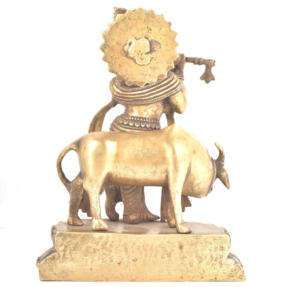 Lord Krishna standing on a lotus base playing a flute with cow standing beside him. Lord Krishna is the most commonly worsipped god and is the eight avatar of lord Vishnu this is also an ideal home decoration statue.
