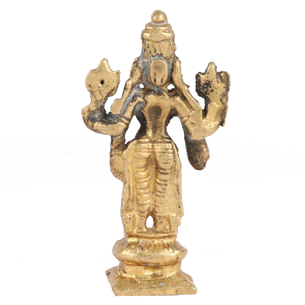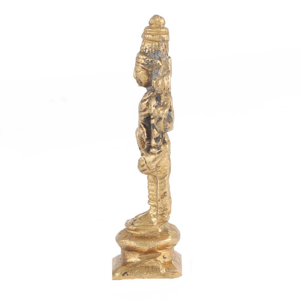 Vishnu is one of the principal deity of Hinduism, and the Supreme Being in its Vaishnavism tradition. Vishnu is the Hindu trinity's "preserver" (Trimurti). This statue is hand polished and refined by Indian artisans in pure brass to give it a glossy look.