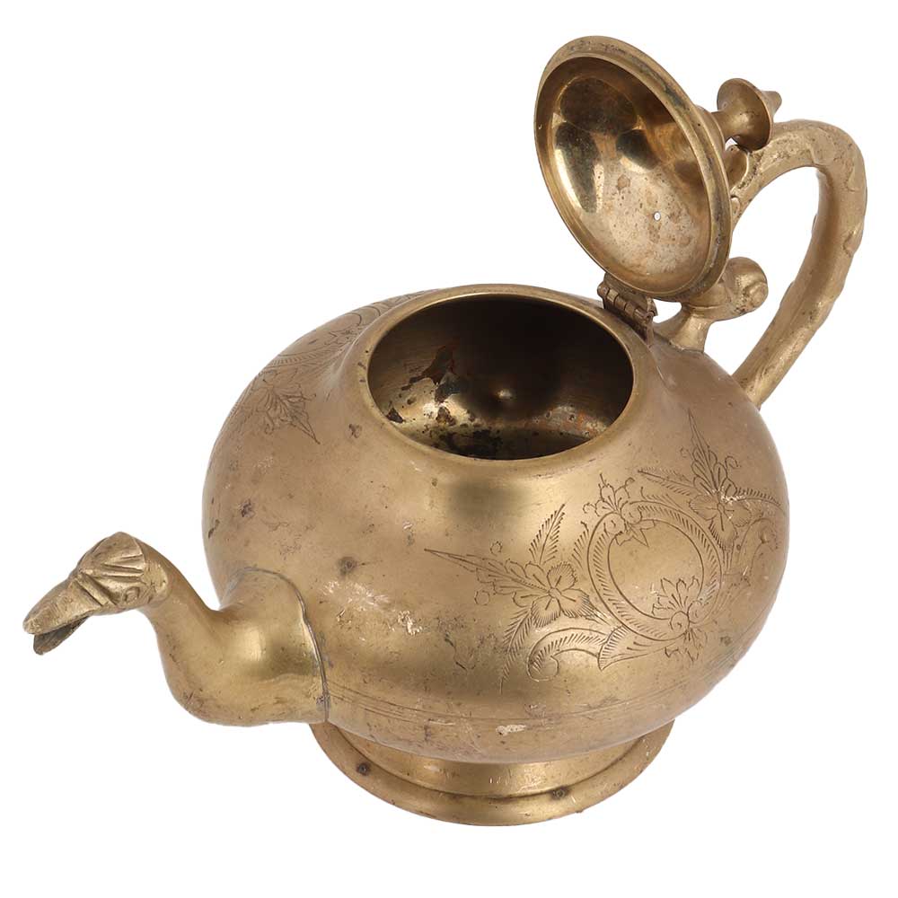 Brass Tea Pot Engraved Floral Design Islamic Style Pot with bird stout. This tea pot has designs embossed on it which makes it more attractive and it has a decorative handle and stout too. Use it as collectable or a personal gift to special someone.