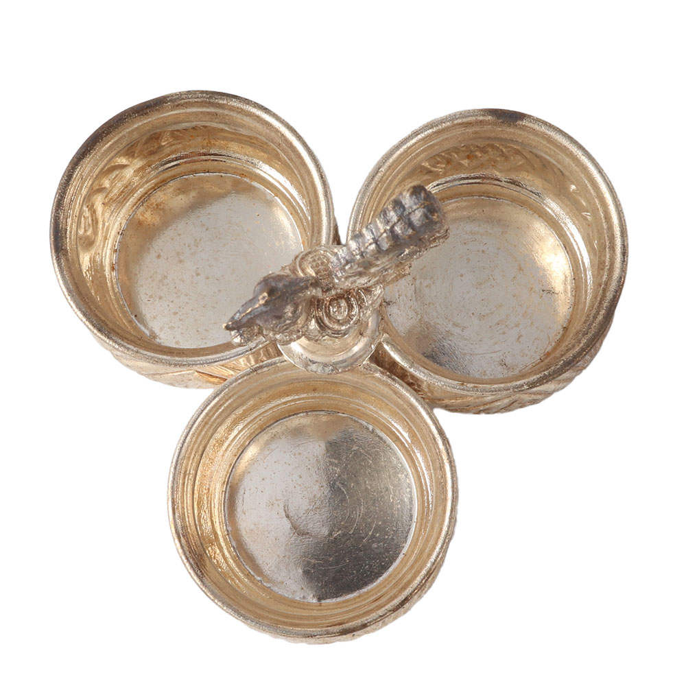 Traditional three-cup silver-plated brass kumkum holder with lovely silver finish, which has excellent usefulness and makes a wonderful gift. The top of it is beautifully engraved with a peacock, and the base is decorated with flower engravings. Haldi, kumkum, and other puja necessities are ideal for storage. Because it has an antique appearance, it looks stunning and may be used both for ornamental purposes in the house and for worship. Give your future sister-in-law this lovely kumkum container as a gift or include it in the wedding gift collection; it is appropriate for any event.