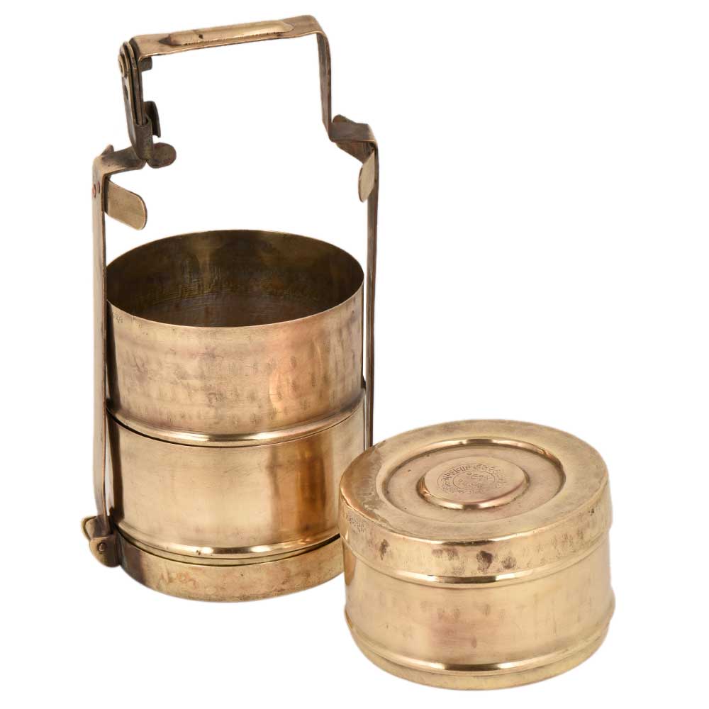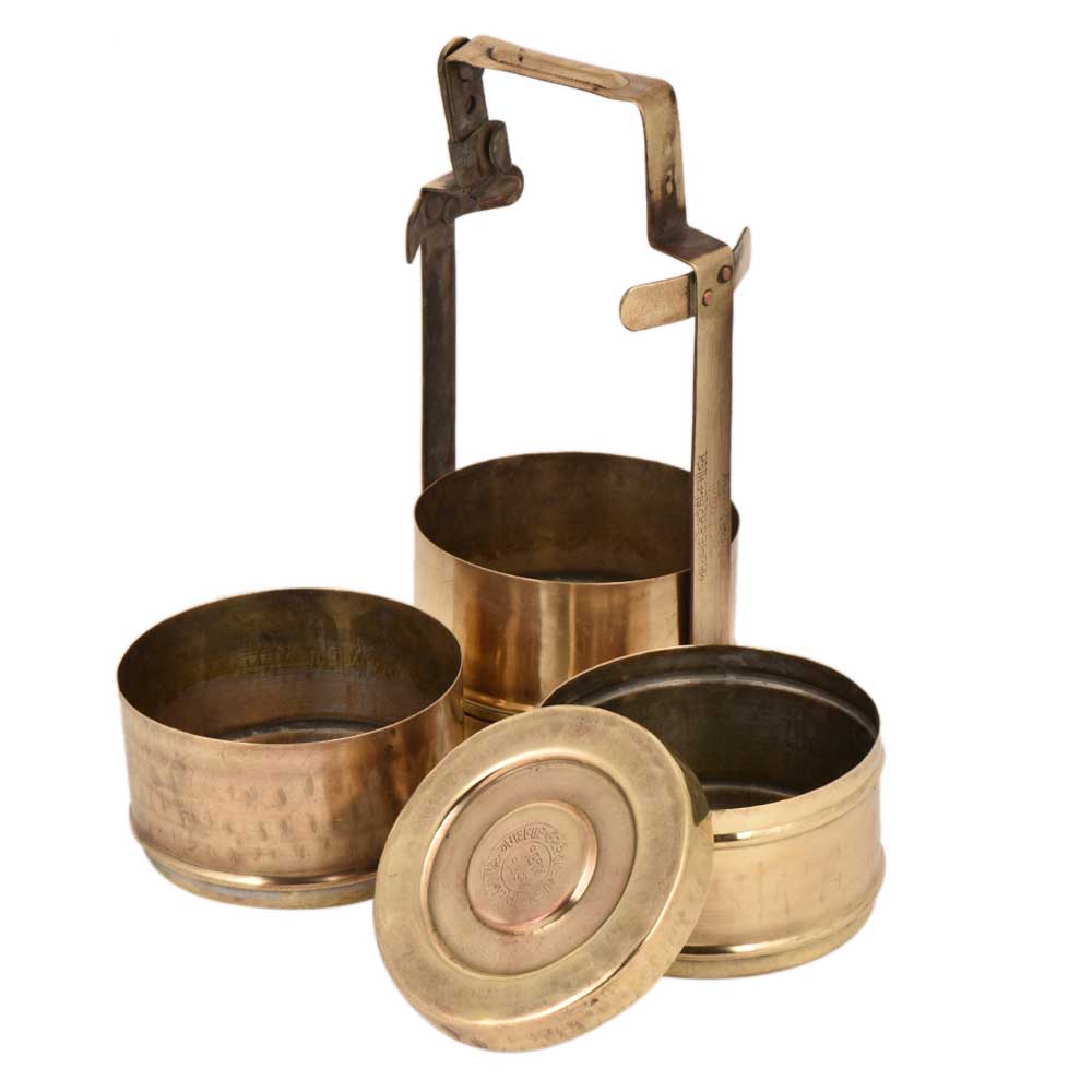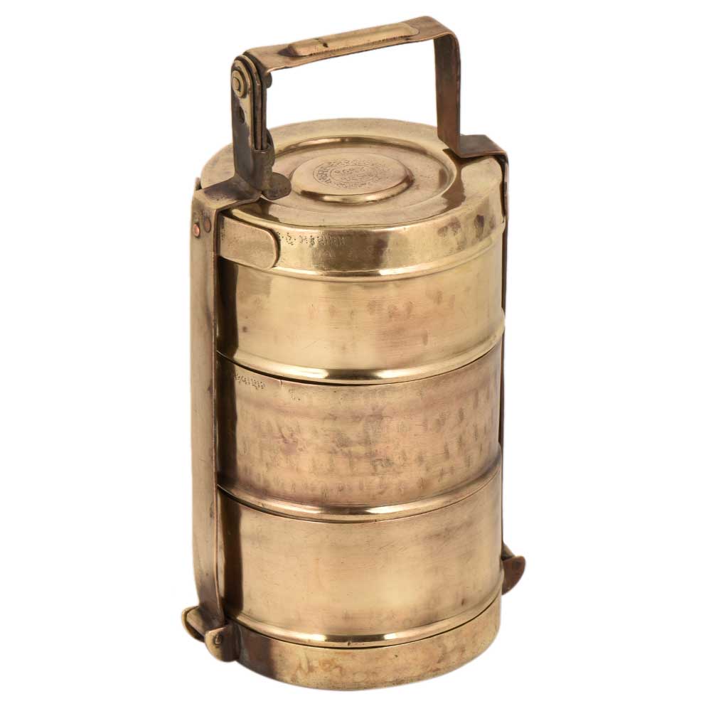 This three tier brass Tiffin box has the name of the owner engraved on the containers . The lid that is place on the top container shows the date of manufacture and other details in native language . Use it for food presentation by bloggers, showpiece, table decoration , corporate gift or personal gilt for your near and dear ones.