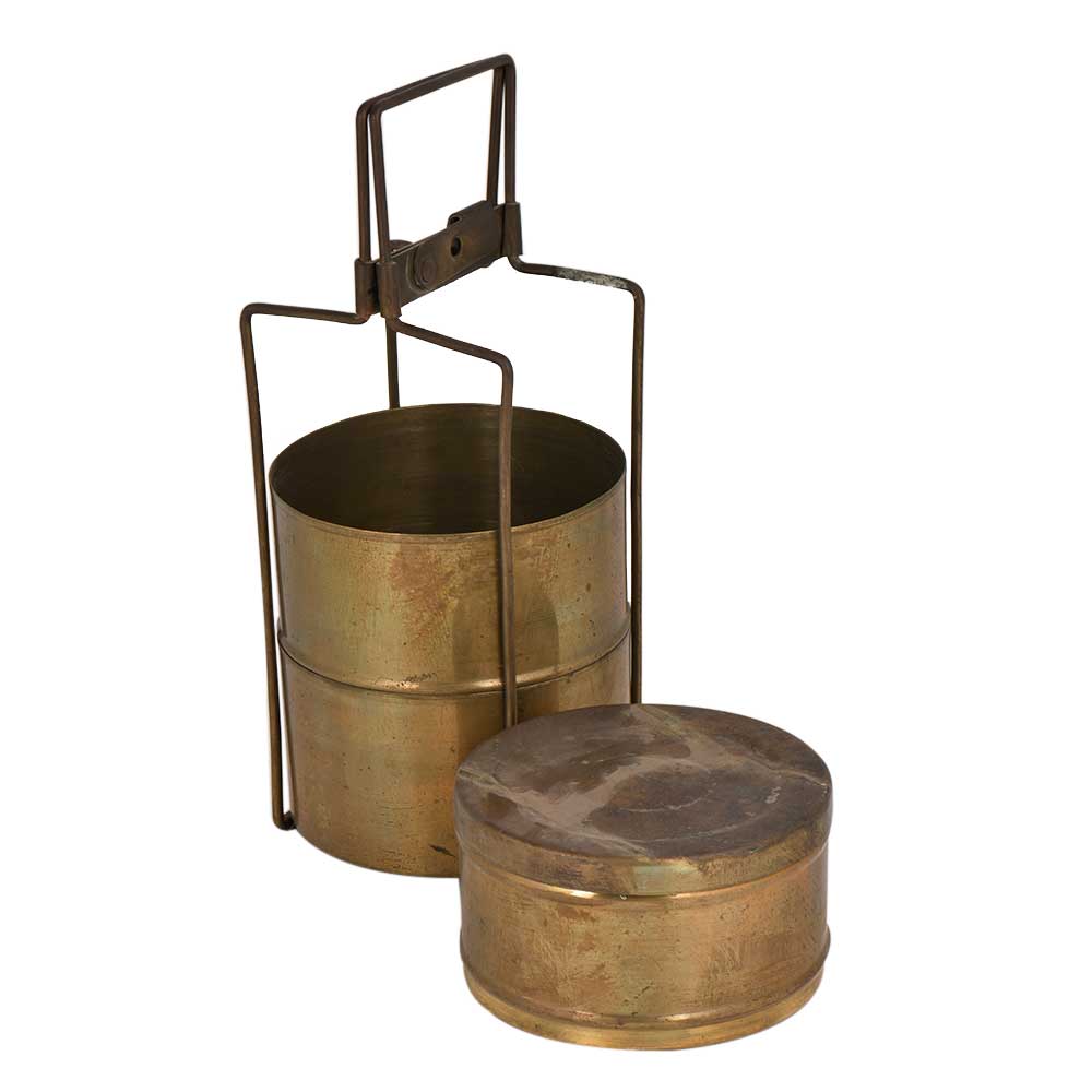 Handmade three tier brass Tiffin box with three removable container and a thin brass locking frame. Earlier it was use for transportation of food from home to office or from dhabbas to places of work. It is now used as a showpiece, for presentation of food, kitchen decoration , gift for your near and dear ones on diwali, Christmas, new year and house warming etc.