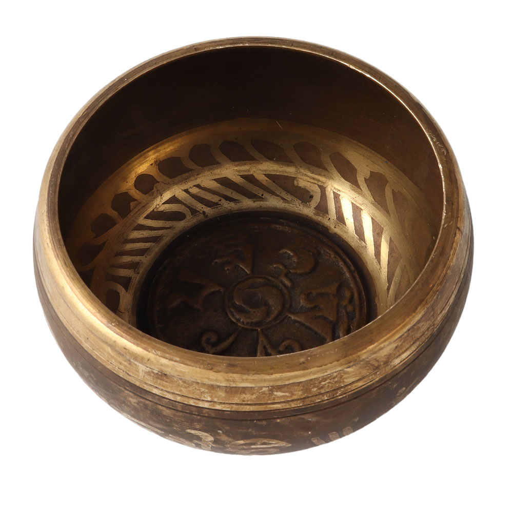 Using this copper-finished brass metal Tibetan mantra singing bowl, you may create a tranquil and healing auditory experience that will transport you into a state of peace. Our Tibetan singing bowl's deep sustained tone, which strikes the ideal mix between expert craftsmanship and exquisite aesthetic design, will provide you the mental relief you've been seeking. A singing bowl produces harmonious, calming vibrations that are beneficial for relaxation, meditation, mindfulness training, and yoga.