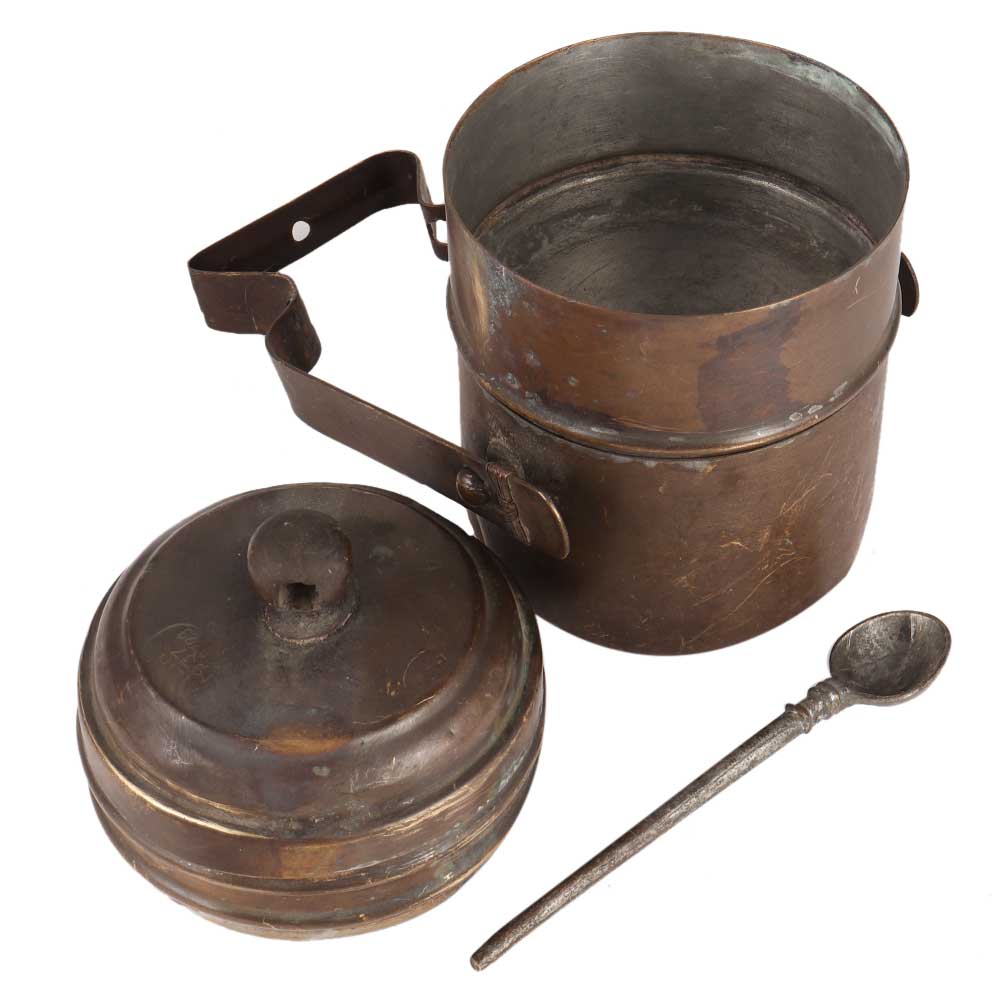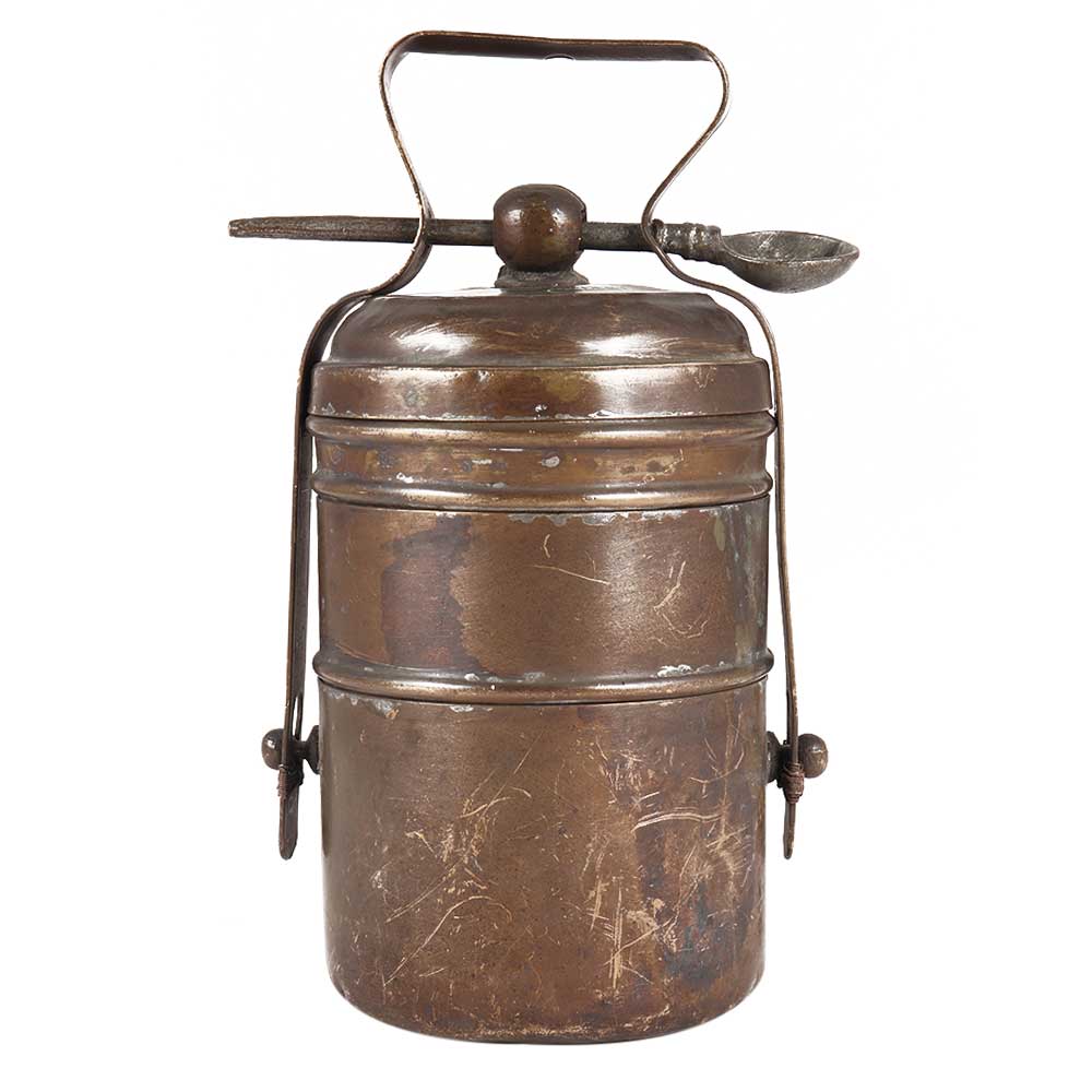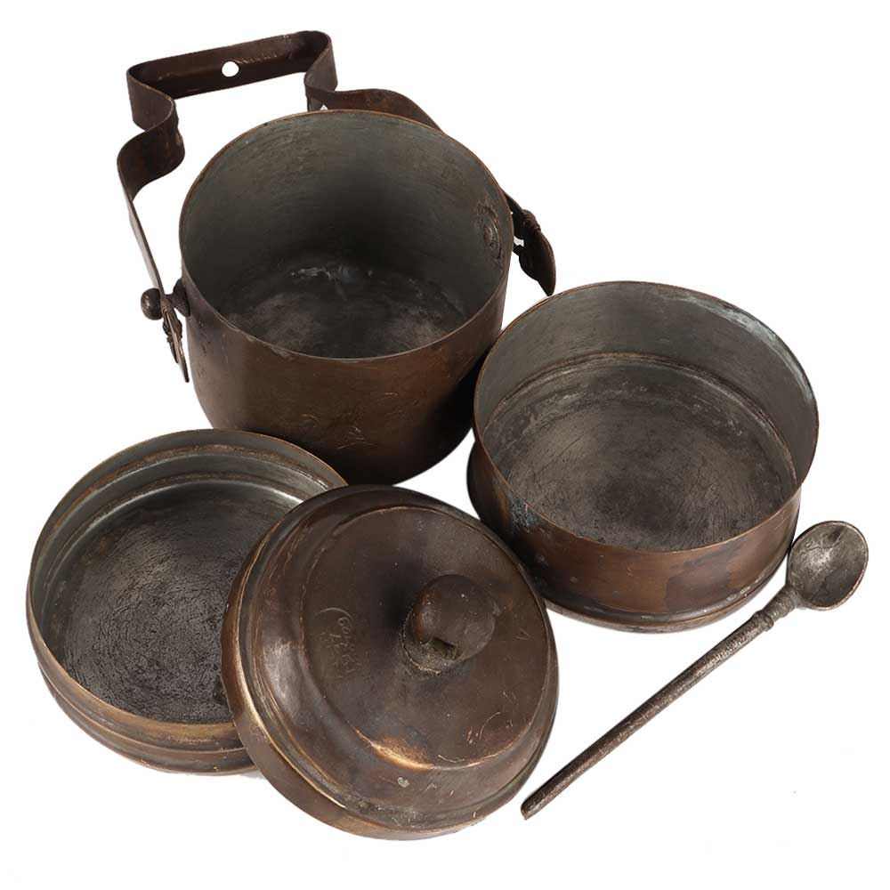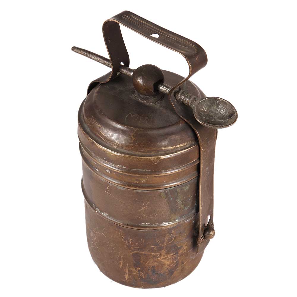 Tiffin Boxes or Lunch Carriers made of old brass. A Tiffin Box is made up of two to five spherical containers connected together by a brass strap framework shaped like an inverse U with a curve at the tip. The spoon connects the containers and the framing, and the upper section serves as a handle for carrying the Tiffin Box.