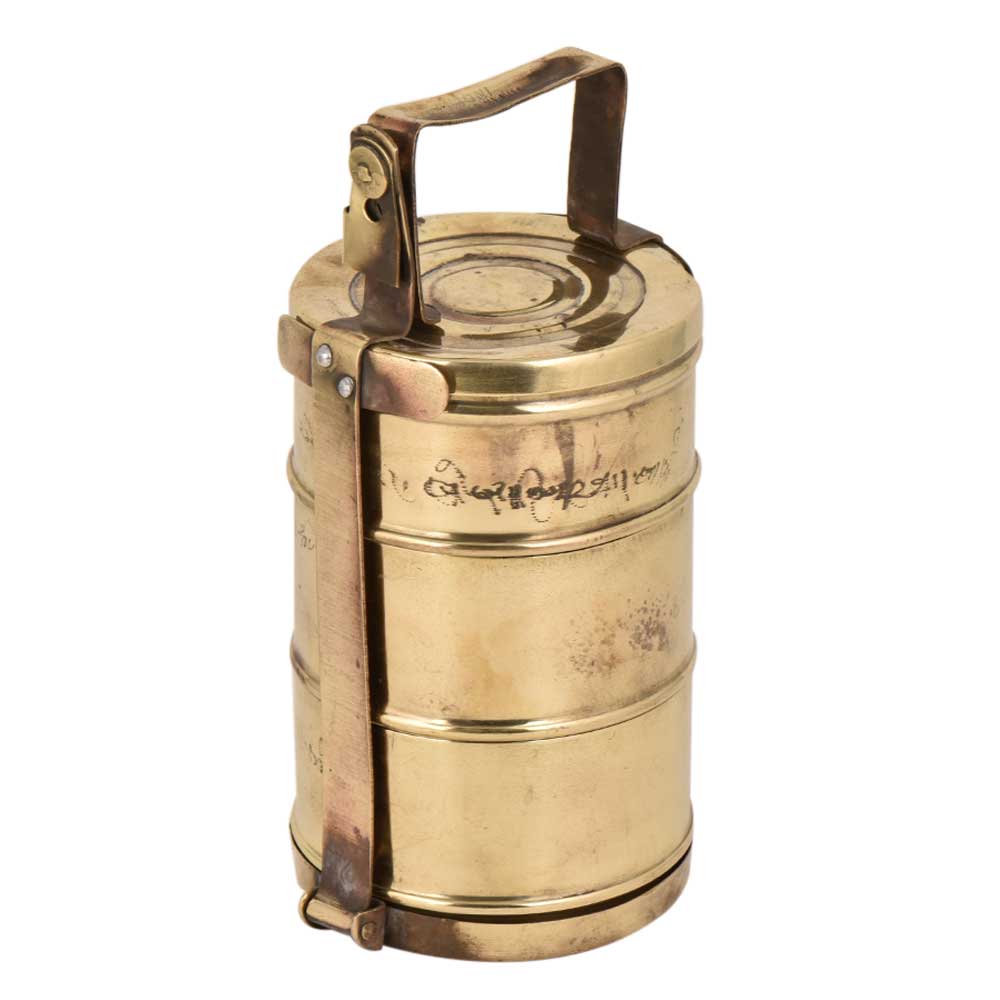 This is traditional dabba or brass Tiffin box made by the expert artisans of India with three storage boxes and lid for the top most container. All the three containers are held together with the help of a thick brass frame that has a traditional locking system. gift it to your near and dear ones on Diwali, Christamas, New Year or as a corporate gift.