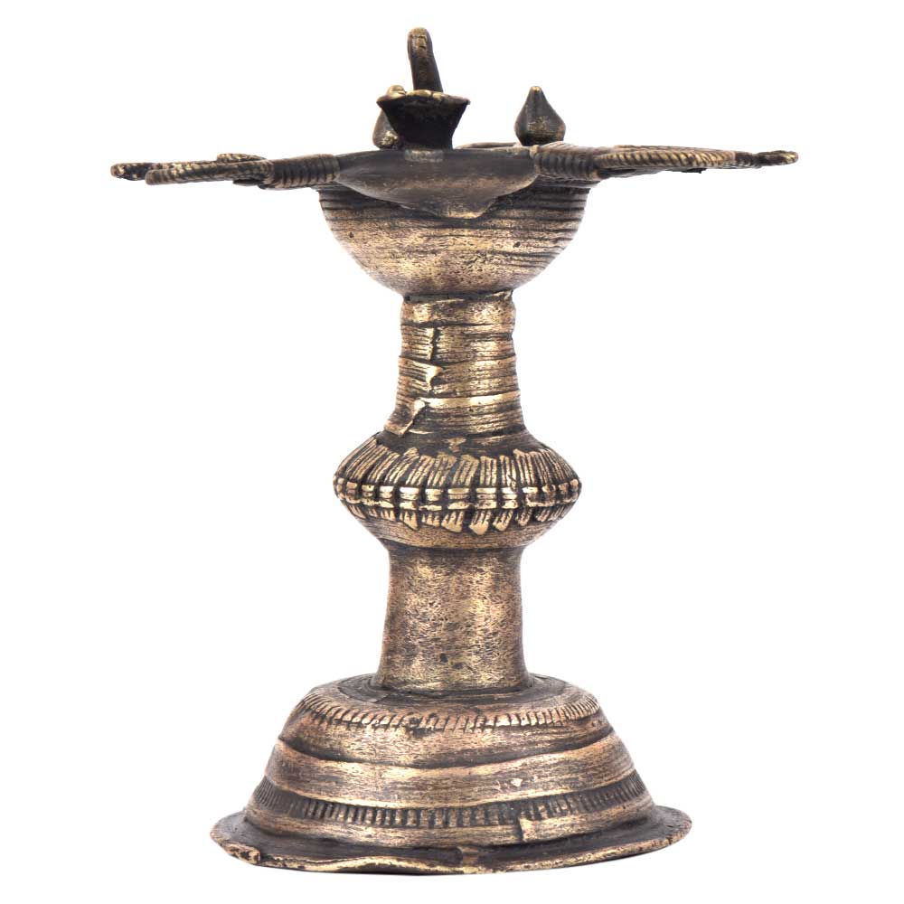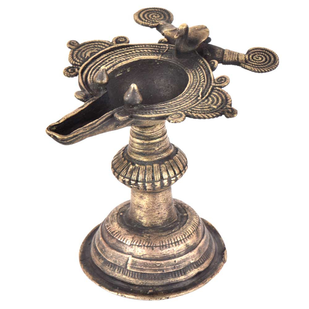 Handcrafted using old lost wax technique primarily practiced in Orrisa and West Bengals by the local or tribal artisans. In this technique the molten wax is poured into desired clay mould and when the wax melts the clay is broken and we get the desired metal object which is further polished to perfection. The Deep Cup Can Be Filled with Oil and Light a Cotton Wick. Diyas/ Oil Lamps are Considered Auspicious as in Hindu Religion. It is detailed with Elephant and Peacock Animals with Beautiful Details.