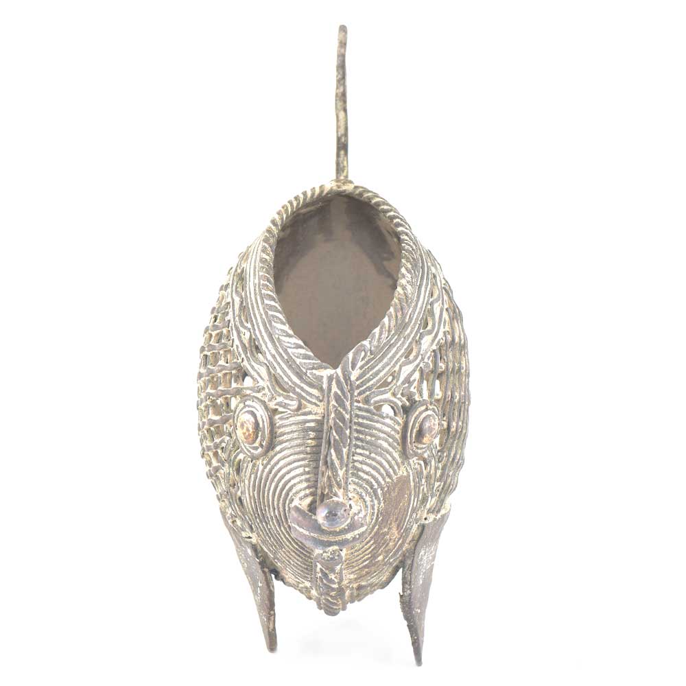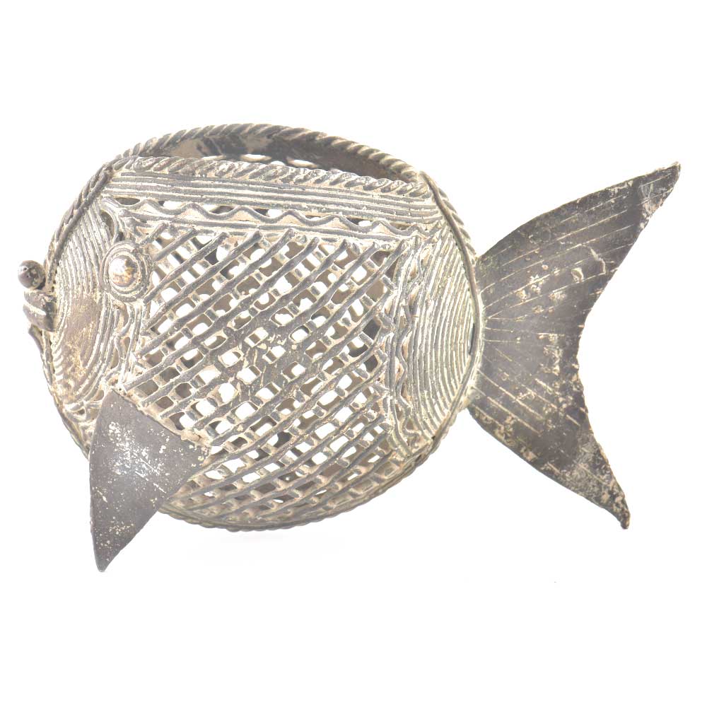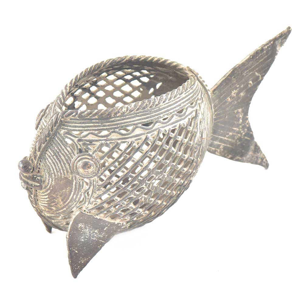 This is a beautiful brass pen stand made by the dhokra tribe of india. It is in the shape of a fish and the net design that is engraved on the pen stand make it look very decorative and artistic. Normally used as a pen stand it can also be used as a napkin holder . Lovely collector's item.