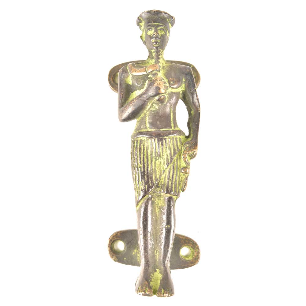 Golden color decorative engraved brass metal door handle having tribal men design. The entire door handle is in excellent condition. An exquisite work of art by the skilled craftsman of India. It can be used as door handle or wall decor as well.