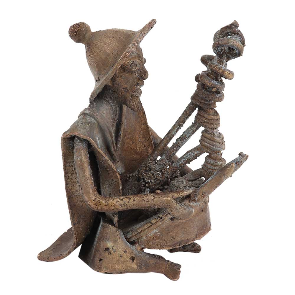 An old brass Statue of tribal African musician playing a rare musician instrument is made by local craftsmen of India. Diwali gift, new year gift, souvenir, office, school table display, house warming gift, wedding gift for friends and family.