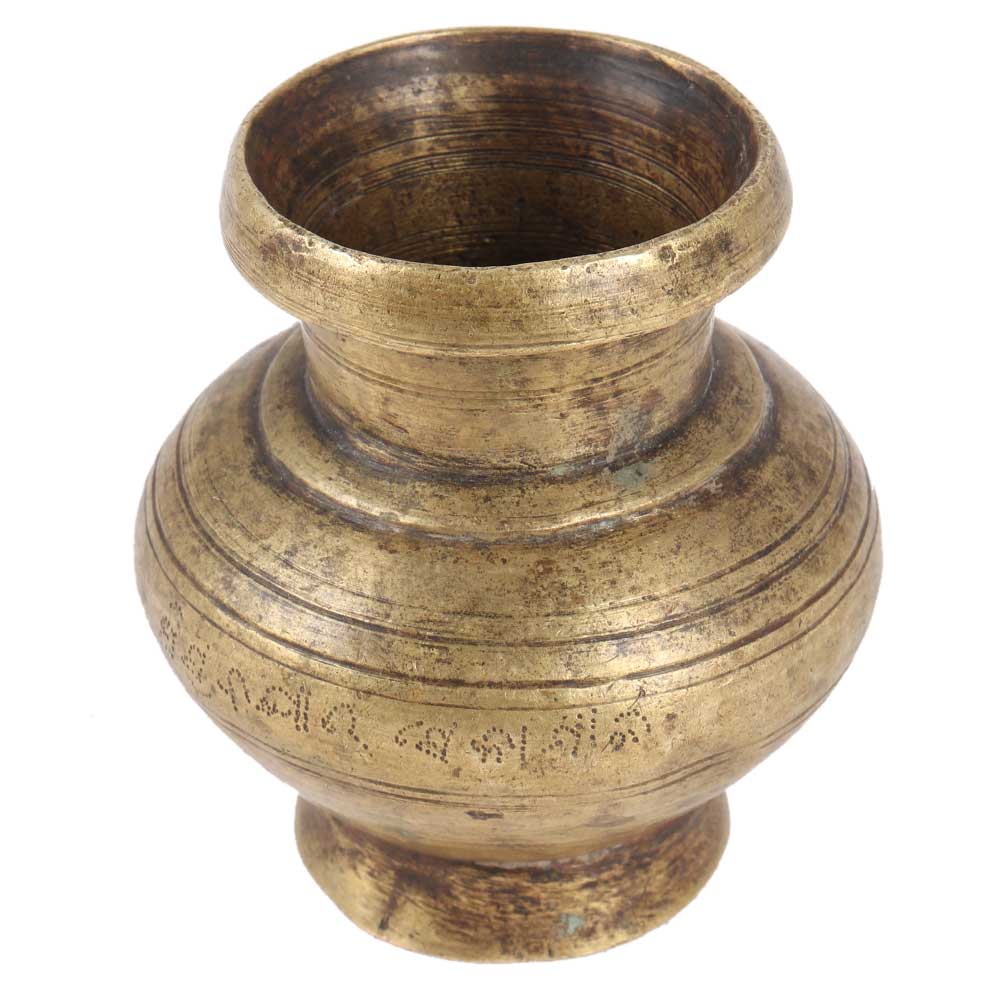 Handmade vase or water pot made of brass from  South India, probably in the nineteenth century. The body has a nice spherical shape, rising to a narrowed neck and a wide mouth with a reinforced rim decorated with various sculpted and incised designs. It can be used for home improvement, or as a gift for family and relatives.