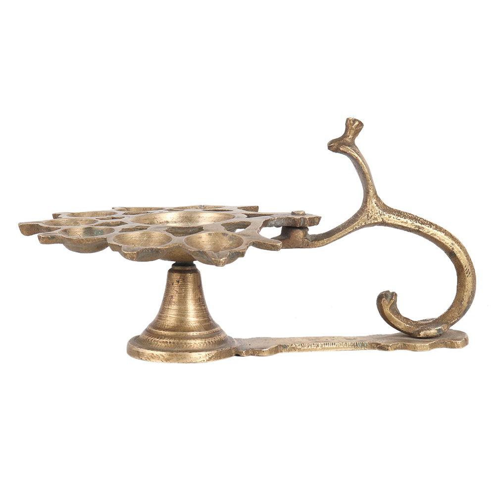 A vintage arti lamp with 8 jyots. It has been carved from brass metal alloy. It has a hancle with engraved cobra. It has a stand to hold it on the surface. In temples, priests often use this arti lamp for worshiping the god. It has 7 small jyots and 1 akhand jyot. Light the arti lamp with mustard oil or desi-ghee with a cotton wick. A perfect arti lamp for your morning and evening prayers in your temple. Its attractive design will beautify your home.