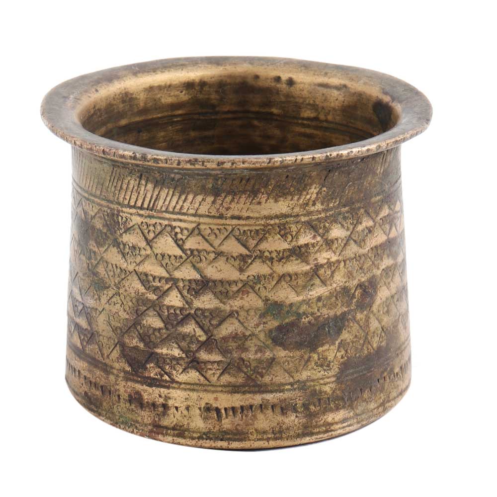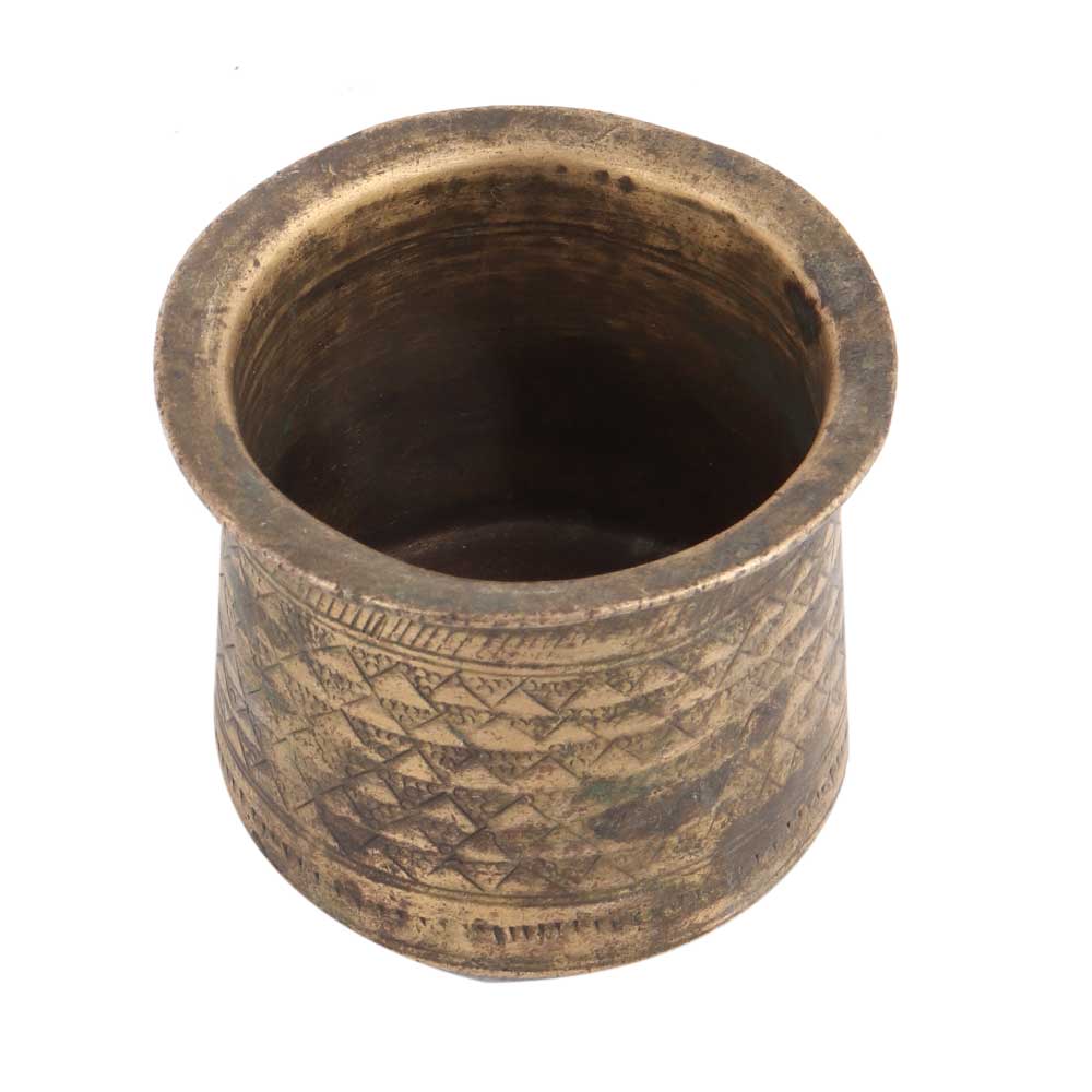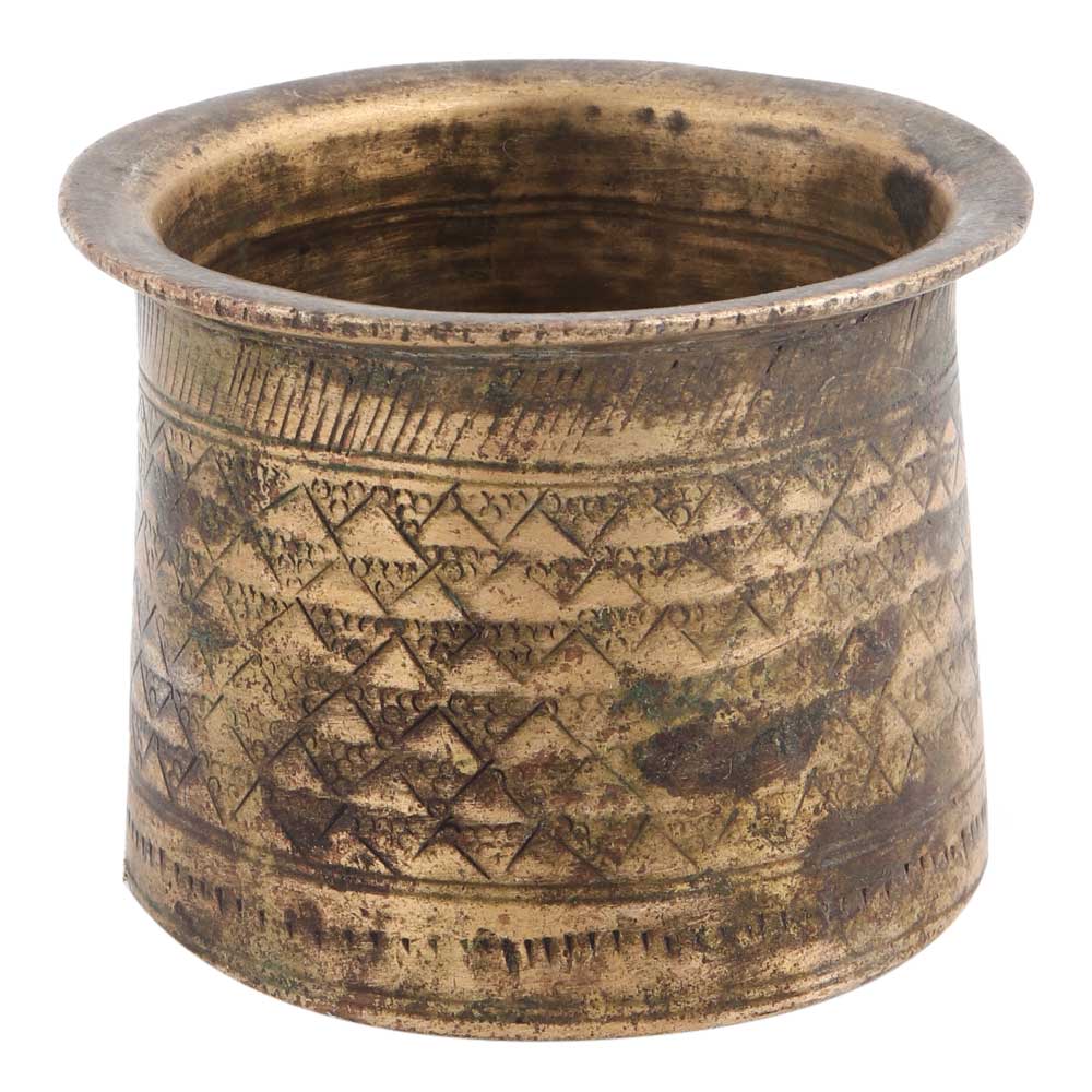 The vintage used Panchpatra small is a great decor idea and functional addition to your home. The brass can be polished to a beautiful finish, and the zinc in the alloy prevents the tarnishing of the product. This vintage used Panchpatra small makes for a great home decor idea. However, to clean the product, use pitambari or similar brass cleaning solutions to enhance the shine. Never use a wire mesh or steel wool over this product.