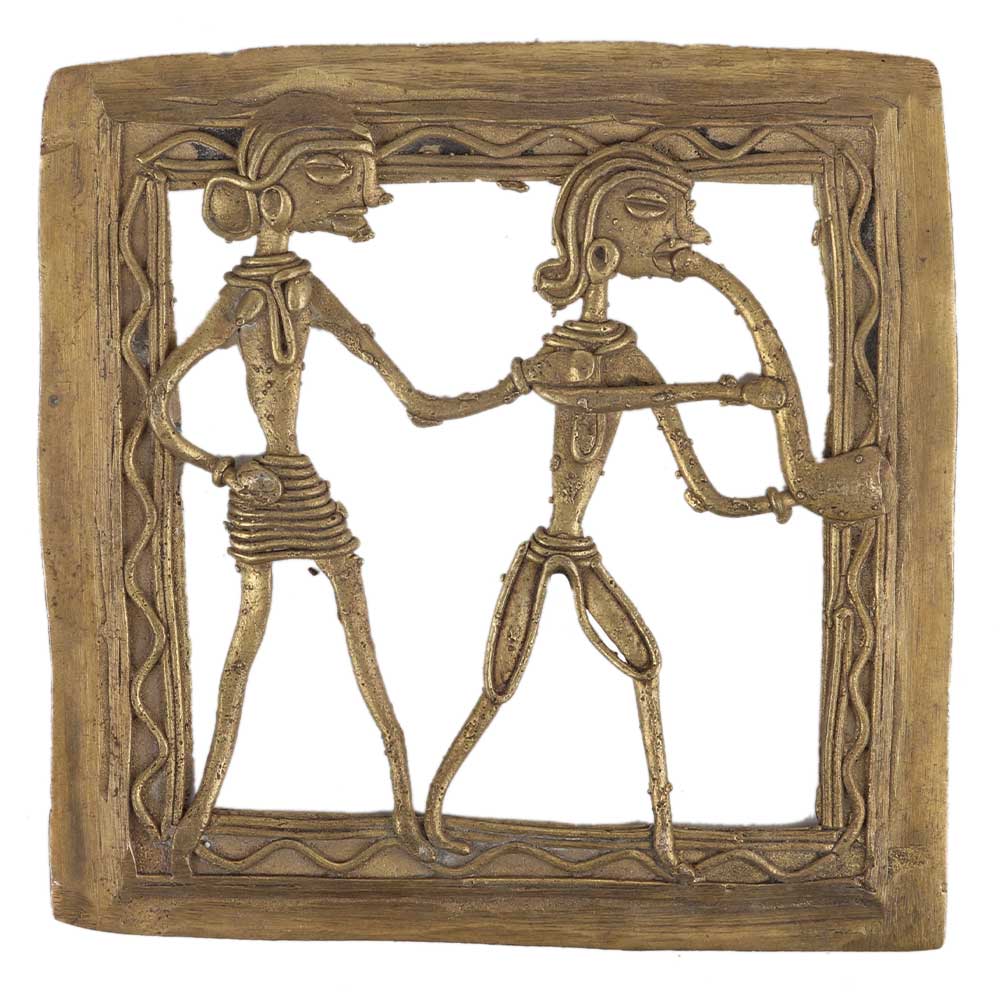 Brass dhokra wall art hanging shows a happy couple where the musician trumpet with lady in brass metal frame. This art shows the brass figurines made in wired form and has a lovely engraved border to add a finishing touch to the hanging. Home decoration, office, restaurants, hotel decoration, showpiece or souvenir.
