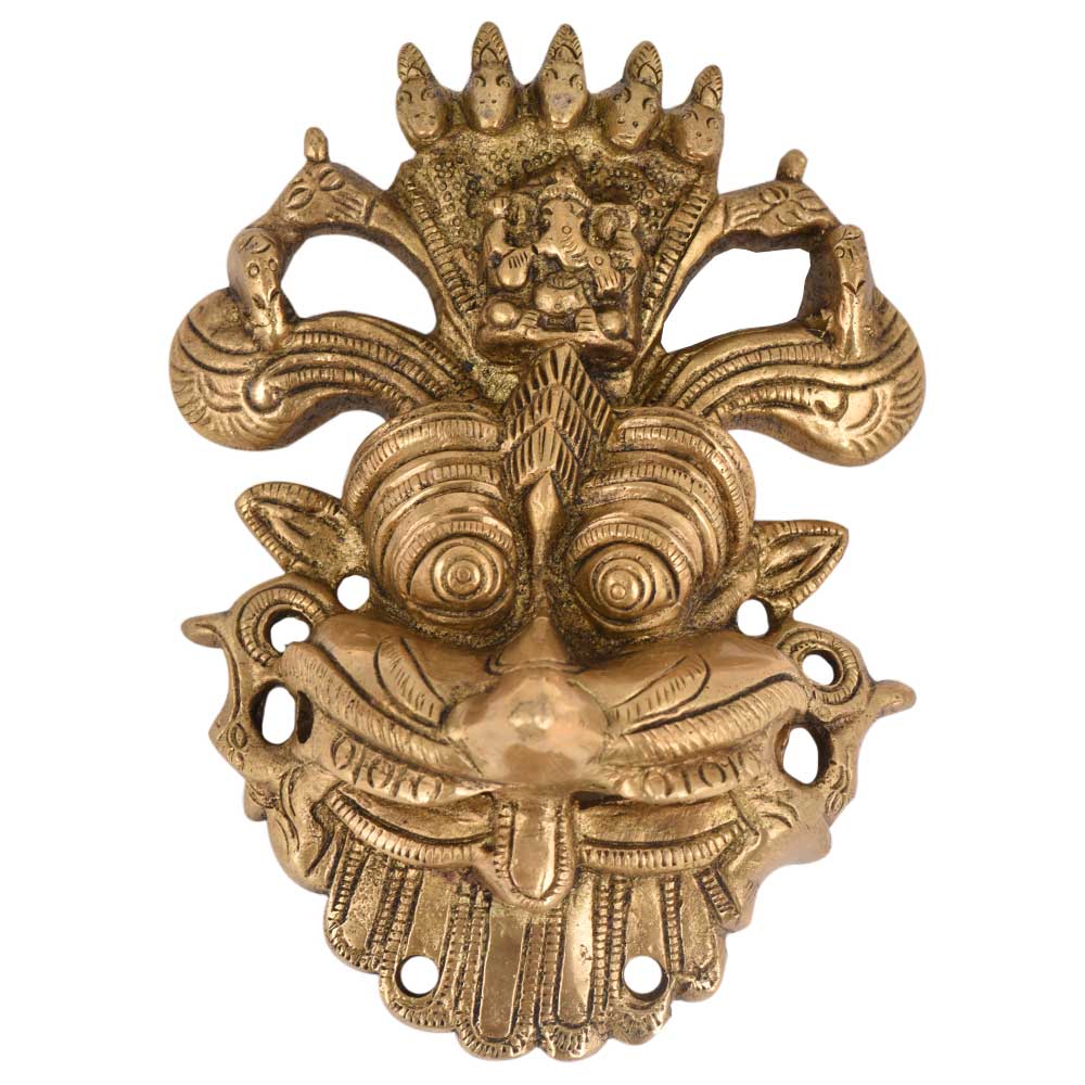 Hand crafted brass wall hanging of religious mahakal fierce monster face which was usually hung on the doors of lord Shiva temple. It has a small ganpati idol on the hood of five hooded sheshnag on top. Diwali gift, New year gift, house warming gift anniversary gift .
