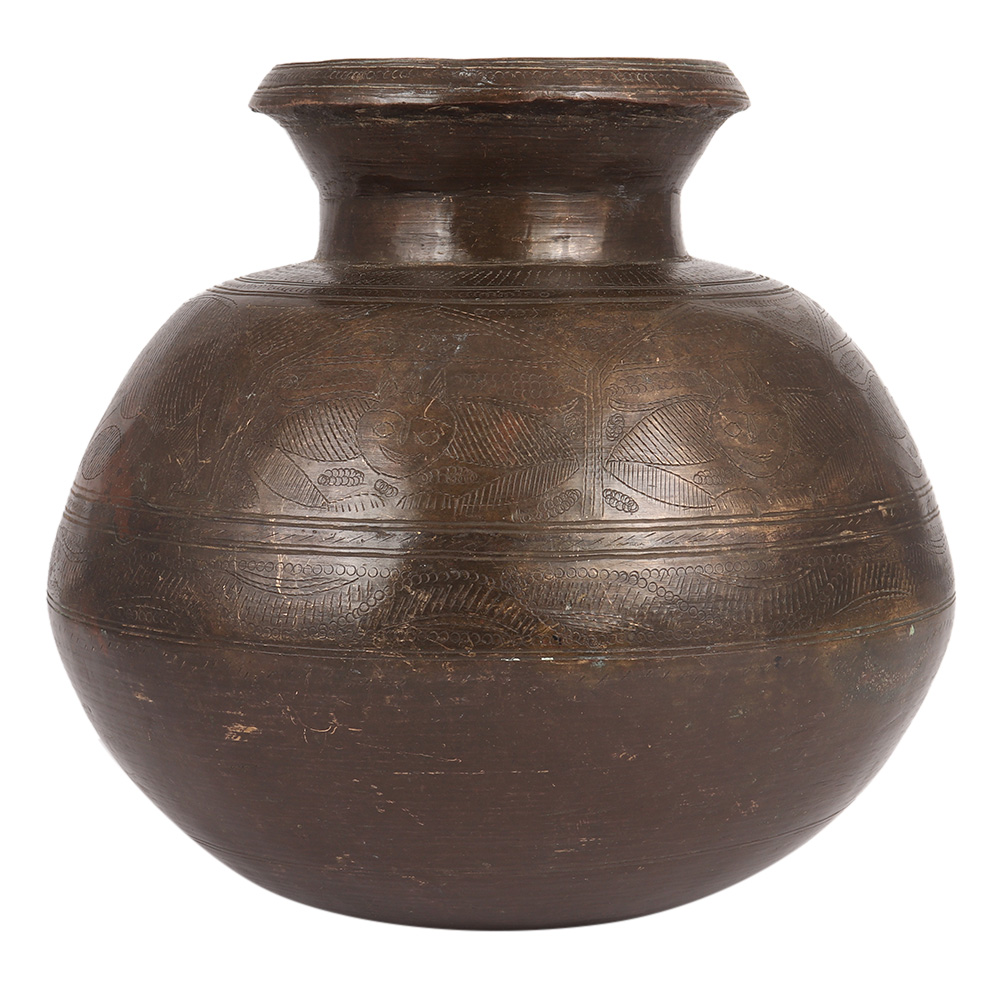 A really lovely unique brass water pot with birds and leaves etched all over the pot's surface. It also has various designer elements engraved on it, such as a diamond and a circle. There are also extra circular borders with varied designs to complete the theme. It is used to keep holy water in temples and other places of worship. The weight is substantial. It can also be used as a vase. It also works well as a decoration.