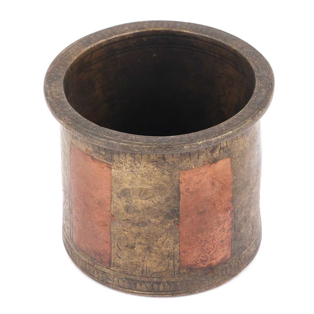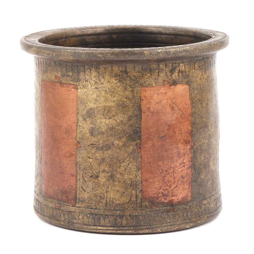 The charnamrita cup is made of bronze and is handmade by the skilled craftsmen of India. This cup used for distribution of charnamrita etc. It has beautiful engraving on it but is faded which grabs more attention.