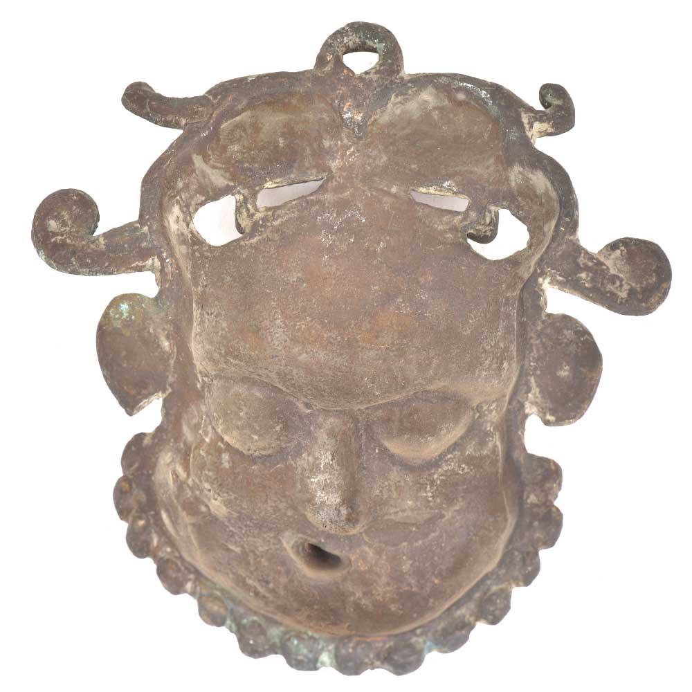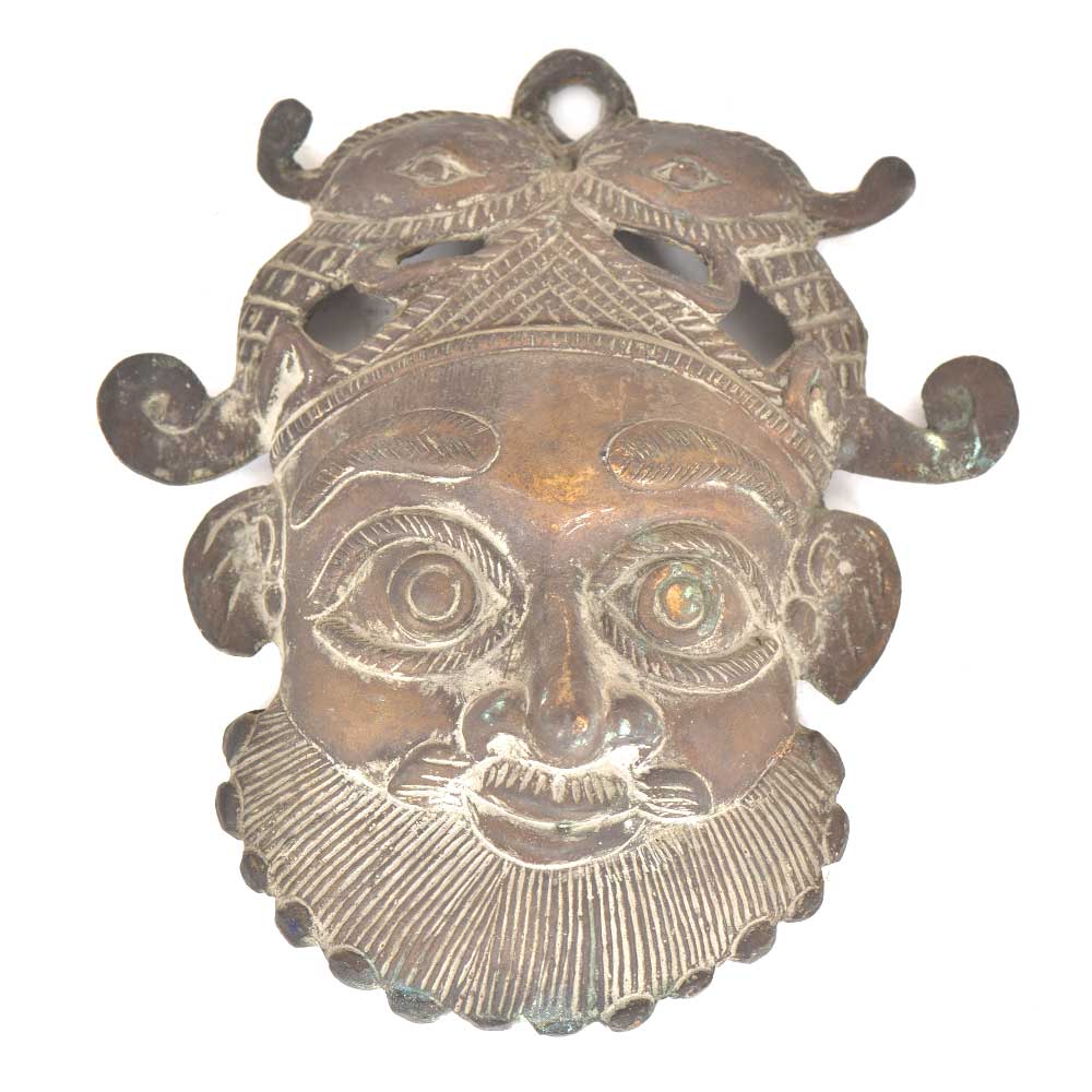 Handmade man face mask wall hanging is made of bronze by the skilled craftsmen of India. This wall art face mask of a man has bulging eyes and a moustache and beard.