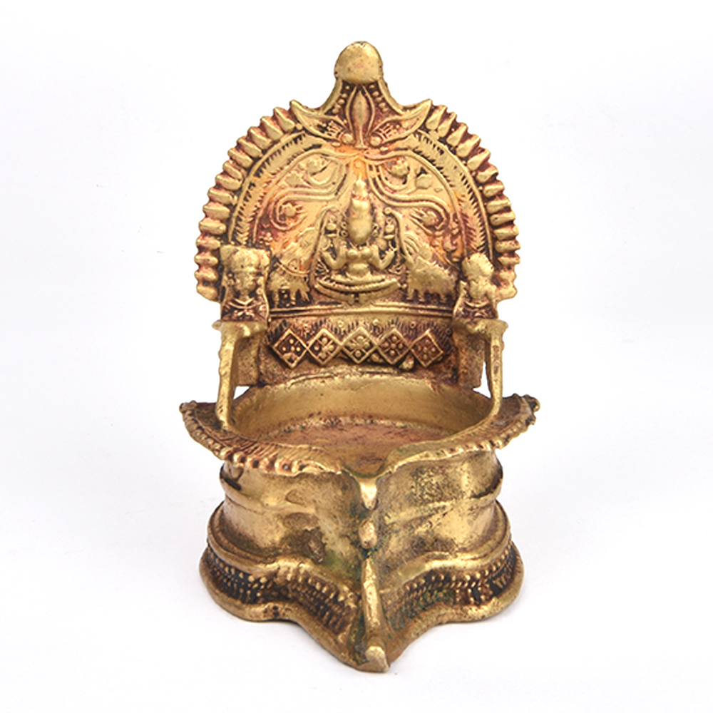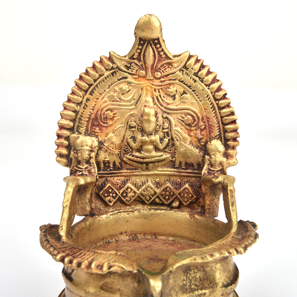 Bronze Oil Lamp with the Image of Laxmi Flanked with Two Elephants. It is Made by Lost Wax Process. Adds Spiritual Flavor to Your Decor. Vegetable Oil, Mustard Oil or Desi Ghee can be Use to Light the Lamp with Cotton Wicks.