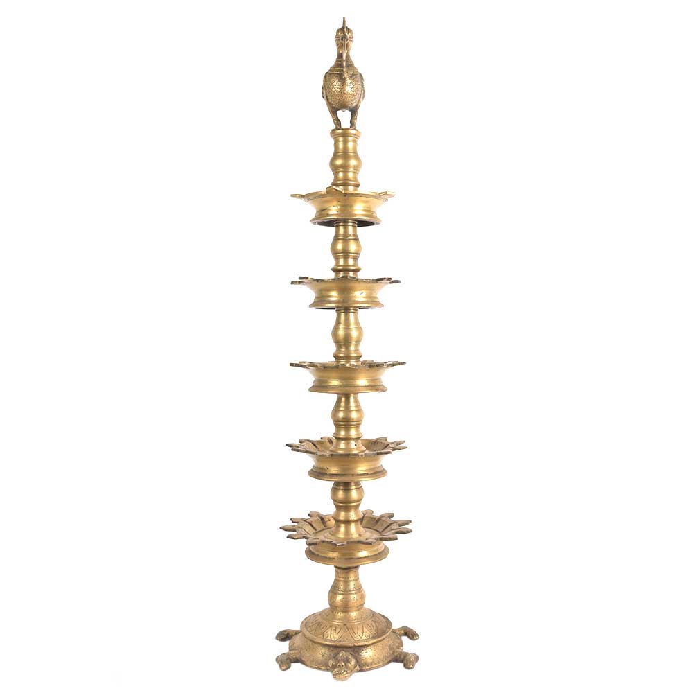 The South Indian Oil Lamp is Handmade by the Skilled Craftsmen of India. This Oil Lamp is Made of Bronze. This Oil Lamp has a Beautiful Peacock on Top of the Oil Lamp and a Turtle Beautifully Made At the Base. The Oil Lamp has 5 Layering. Mustard Oil, Ghee and Different Types of Oil can be Use to Enlighten This Lamp.