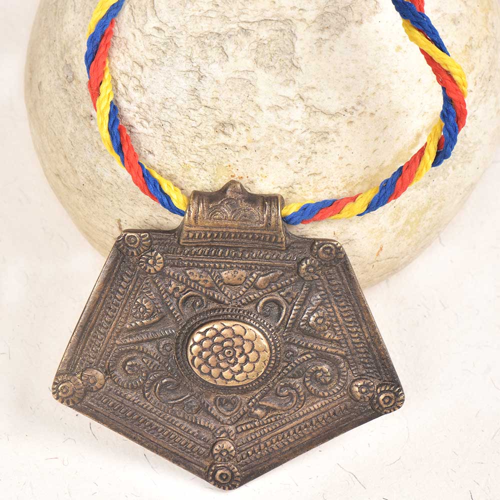 Express your individuality with this Handcrafted Bronze Pendant in a striking pentagon shape, artfully designed from brass and adorned with multicolor detailing. The geometric form symbolizes balance and strength, while the hand-finished surface reflects rich artisan craftsmanship. Polished to perfection, this pendant blends the classic allure of brass with vibrant artistic accents — a statement piece that adds cultural flair to modern jewelry collections.