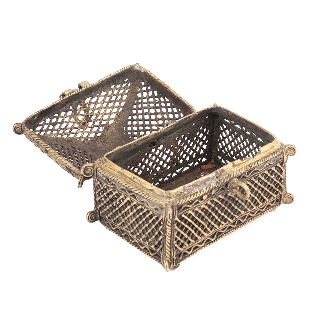 The dhokra art jewellery box is made of bronze and is handmade by the skilled craftsmen of India. This jewellery dhokra art is beautifully made for storing, gifting decoration etc. It has very pretty engravings which makes it more attracting and has a lock system to ensure safety.