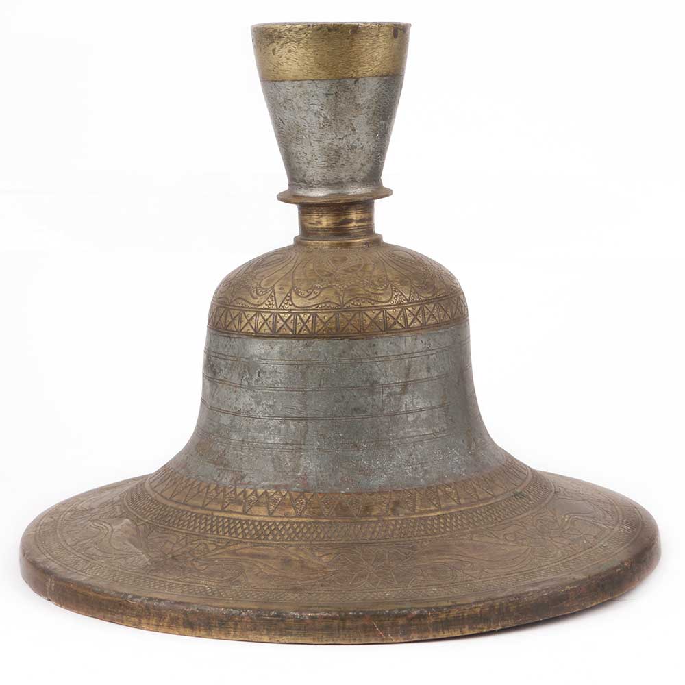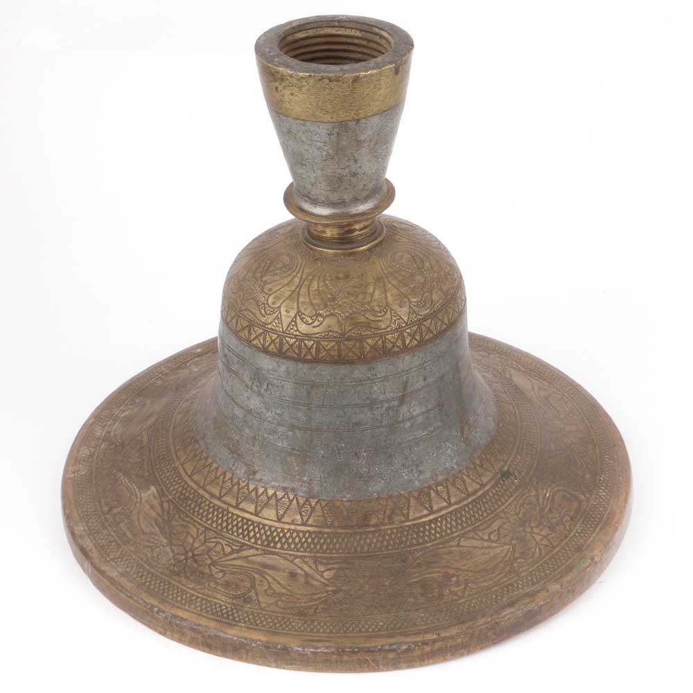 Old Rustic Looking and Patinated Brass Hookah Base has a Silver Color in Between to Add It a Classy and Royal Look. The Design is Engraved on the Brass Base. This Formed the Base of the Actual Hookah and Now It is Used as a Collectors Item.