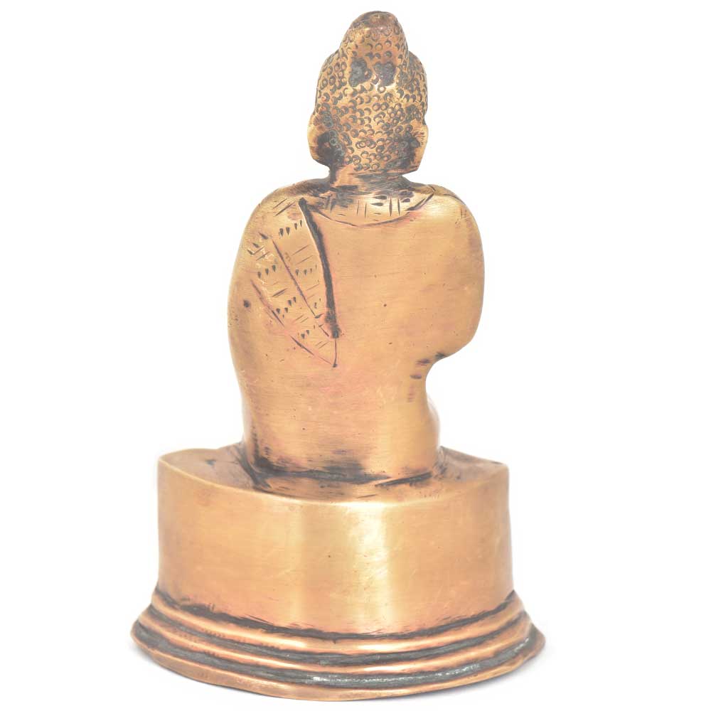 Bronze Buddha Statue sitting with both feet on lotus, his face with downcast eyes and a faint smile, the ushnisha is plain without curls, his right hand in the gesture of "fear-not" and his left in his lap, resting on a two-tier pedestal. Keep it on the display shelf of your house or use it for gifting purpose.
