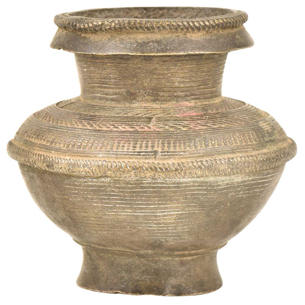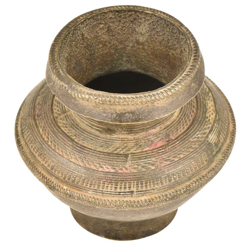 This Handmade Tribal Water Pot is Handmade by the Artisans of the Dhokra Tribe. The Design is Very Rustic with Patterns Engraved on the Surface of the Pot. The Top of the Pot has Additional Engravings Which Gives It a Very Tribal Shape. The Base of the Pot is Made in Solid Bronze That Gives a Height: to the Pot and Also Keep the Bottom of the Pot Away From the Floor.