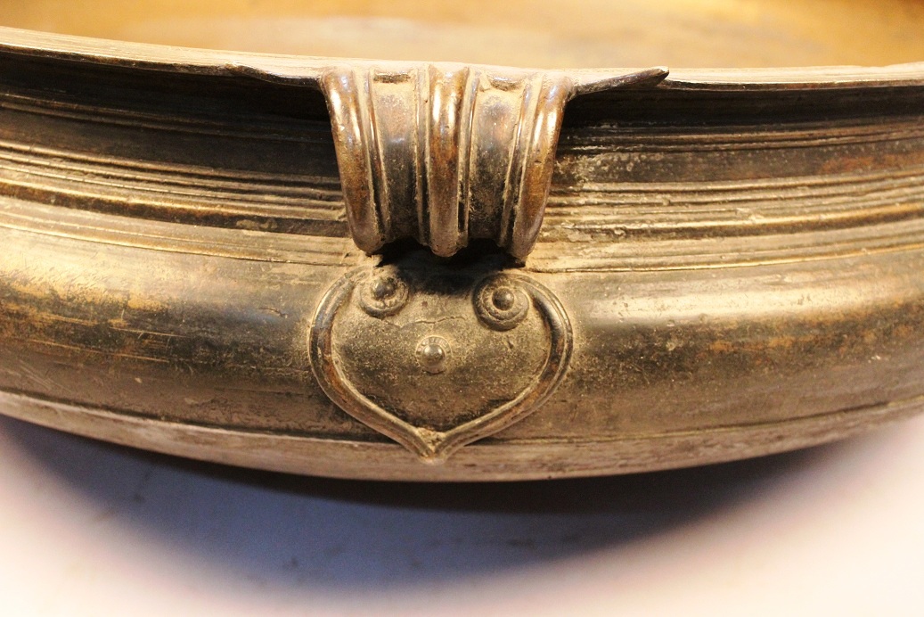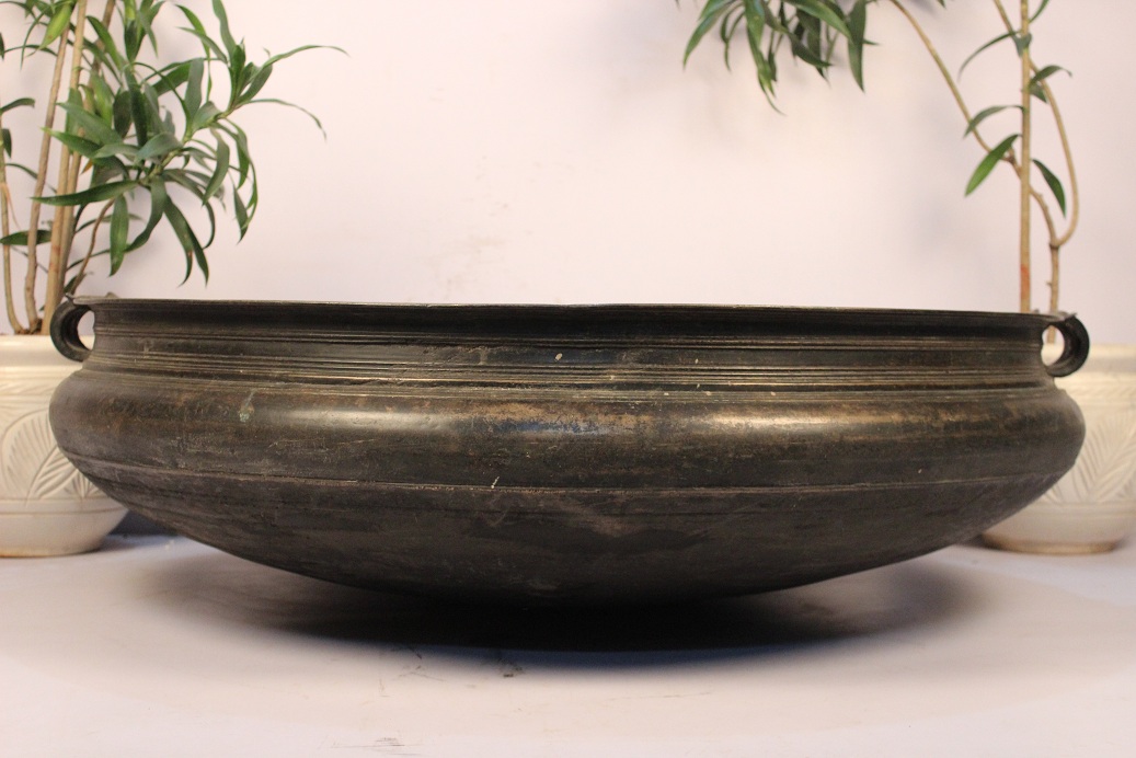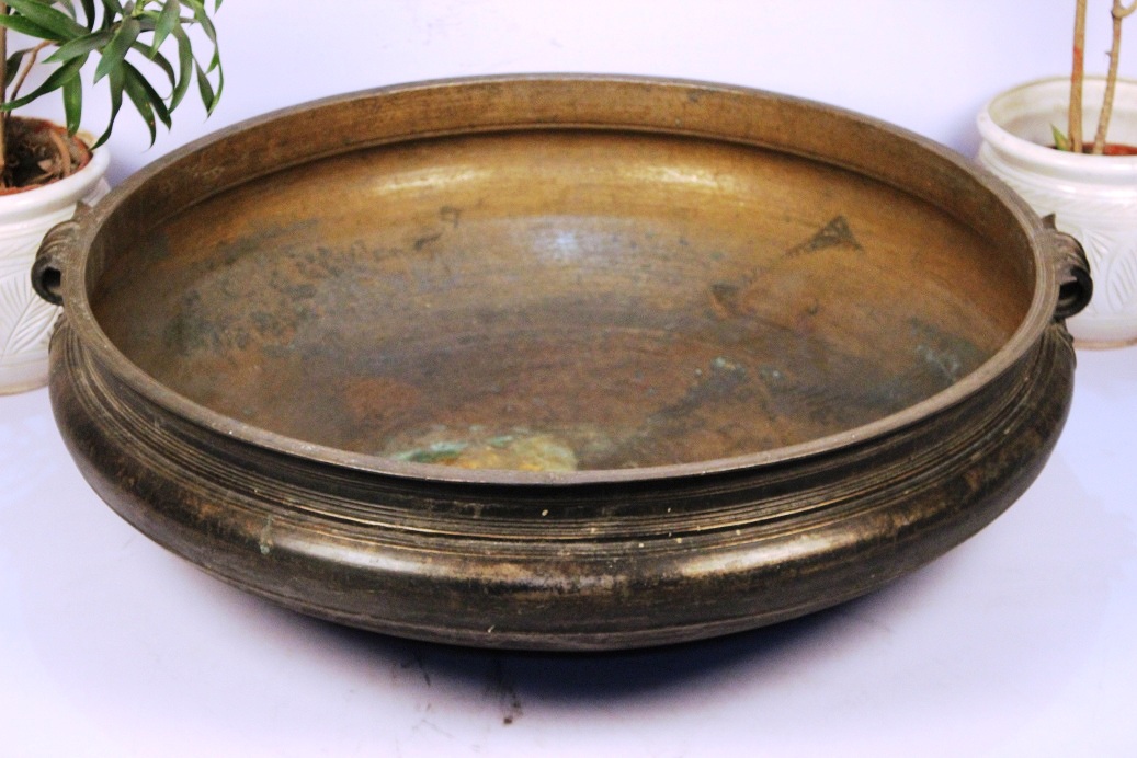 South Indian Bronze Urli Made by Lost Wax Process. One of Its Kind. It Was Used Before in India to Cook Food to Serve Gods and Deities. Now It is Ideal to Put Flowers and Floating Candles and Use It as a Perfect Indoor Decoration. The Beauty of This Piece Lies in the Way of Making This Piece. This Urli is Made by Lost Wax Process. Which is Completely Done by Hand. It Serves as a Beautiful Bronze Bird Bath Too.