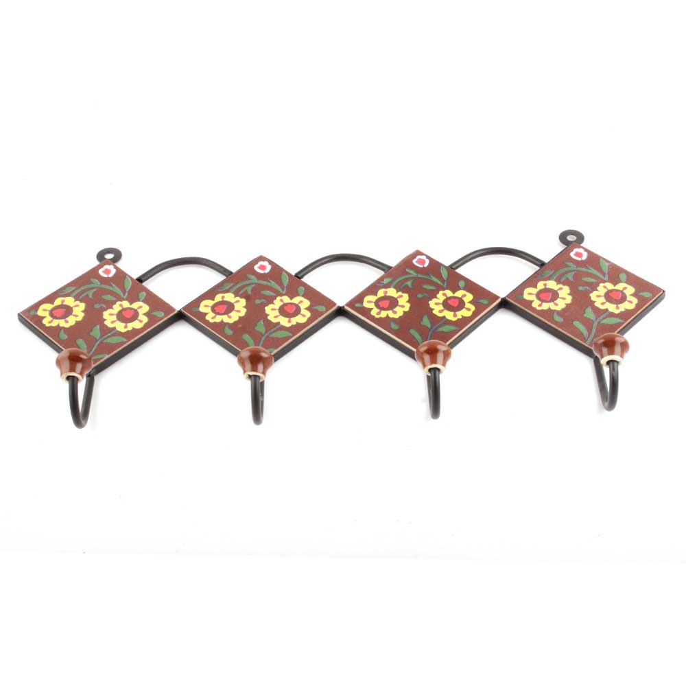 Brown And Yellow Ceramic Floral Tiles Hooks Online. When Put on Wall or Cabinet It is An Art in Itself. The Metal Part of this Hook is Black Powder Coated.