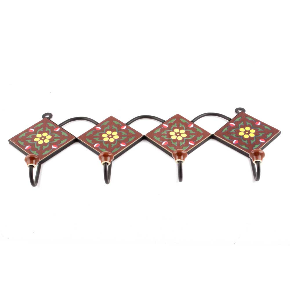 Brown And Yellow Tiny Flower Ceramic Tiles Hooks. When Put on Wall or Cabinet It is An Art in Itself. The Metal Part of this Hook is Black Powder Coated.
