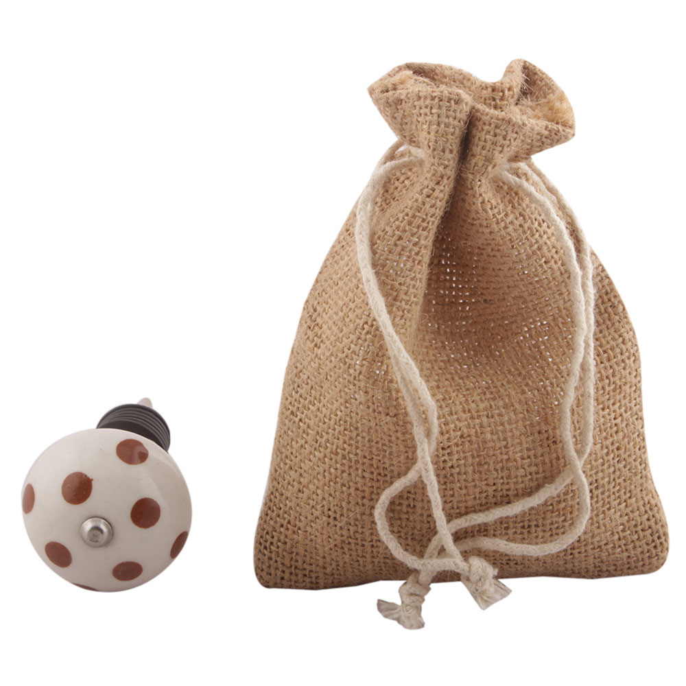 Brown Dotted Ceramic Floral Wine Stopper. Zinc Alloy Wine Bottle Stopper with Attractive Jute Bag Packaging.