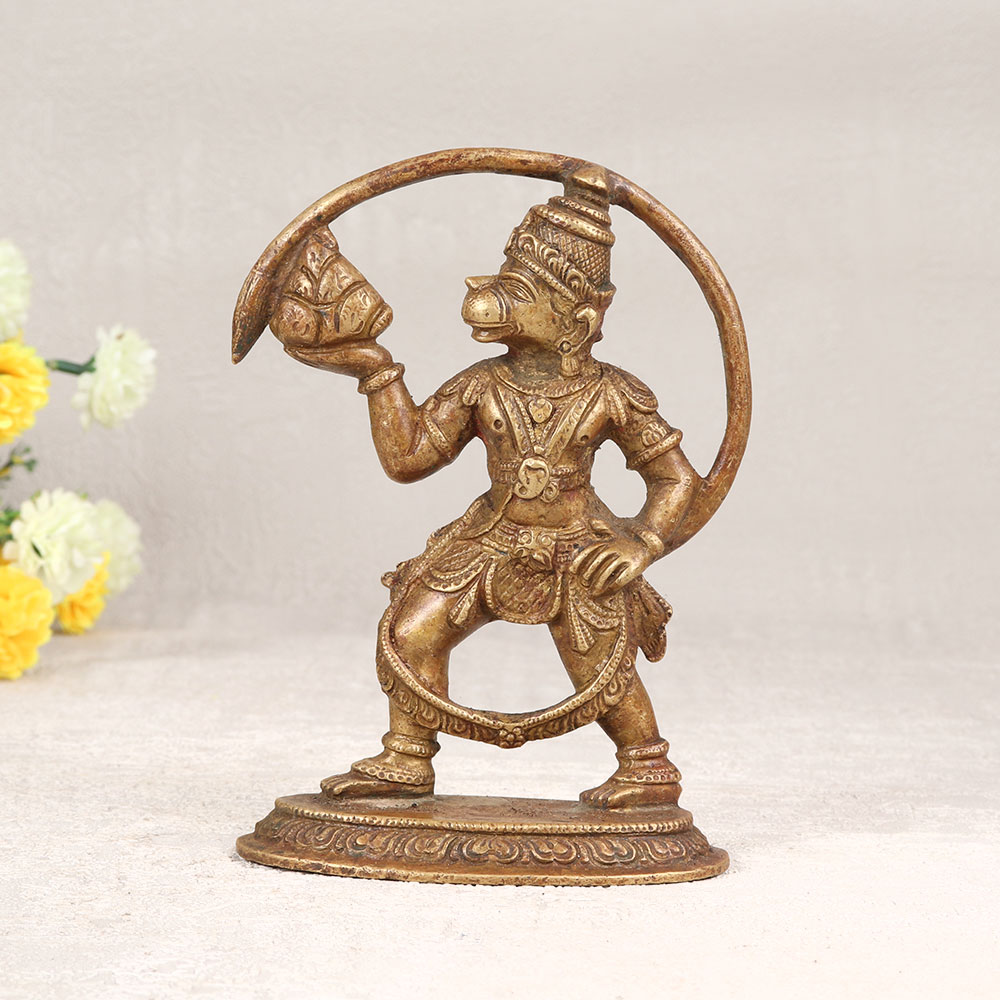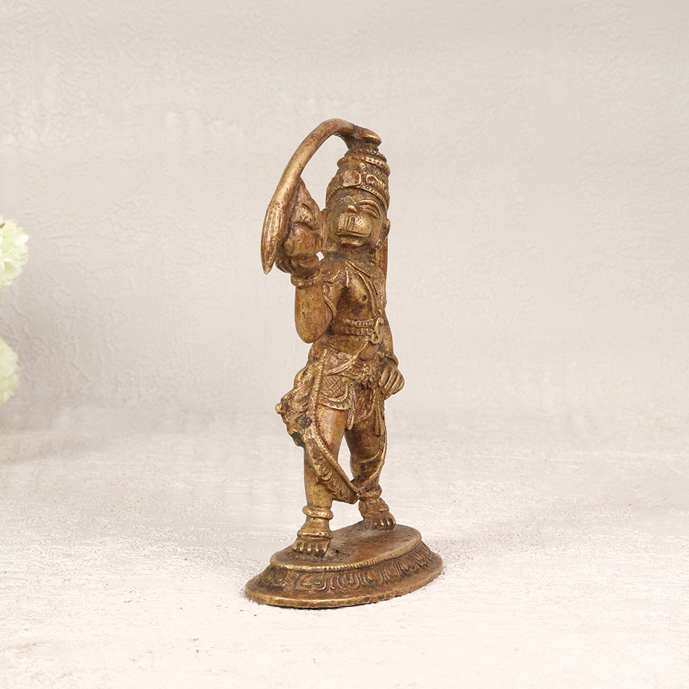 A Brass Lord Hanuman Standing Statue that is a captivating masterpiece meticulously handcrafted by talented Indian artisans. This divine creation is made from high-quality brass, ensuring durability and a timeless aesthetic. The statue features a majestic depiction of Lord Hanuman with a long, graceful tail, exuding a sense of divine power and devotion. With its antique brown finish, this statue possesses a rustic charm that adds warmth and character to any space. Perfect for display in homes, offices, restaurants, hotels, or prayer rooms, it serves as a symbol of spiritual strength and protection. The intricate detailing showcases the artisan’s dedication to preserving traditional craftsmanship, making it a valuable addition to any vintage collection. This Brass Lord Hanuman statue also makes for a thoughtful and meaningful gift for your family, friends or relatives on special, festive, or auspicious occasions. Whether it's a housewarming, Diwali celebration, or any joyous event, this statue embodies blessings and positive energy. Embrace the divine aura and elevate the ambiance of your surroundings with this timeless piece of art.
