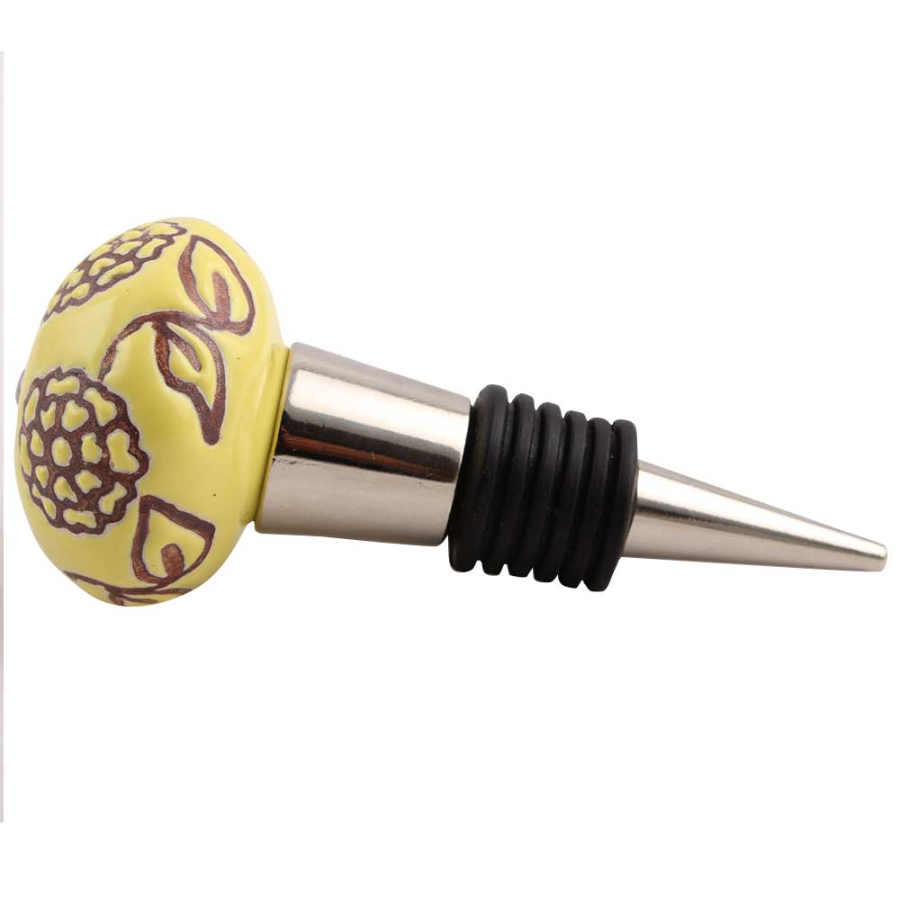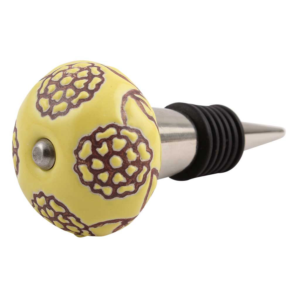 Brown Marigold Etched Ceramic Floral Wine Stopper.zinc alloy wine bottle stopper with attractive Jute Bag Packaging.