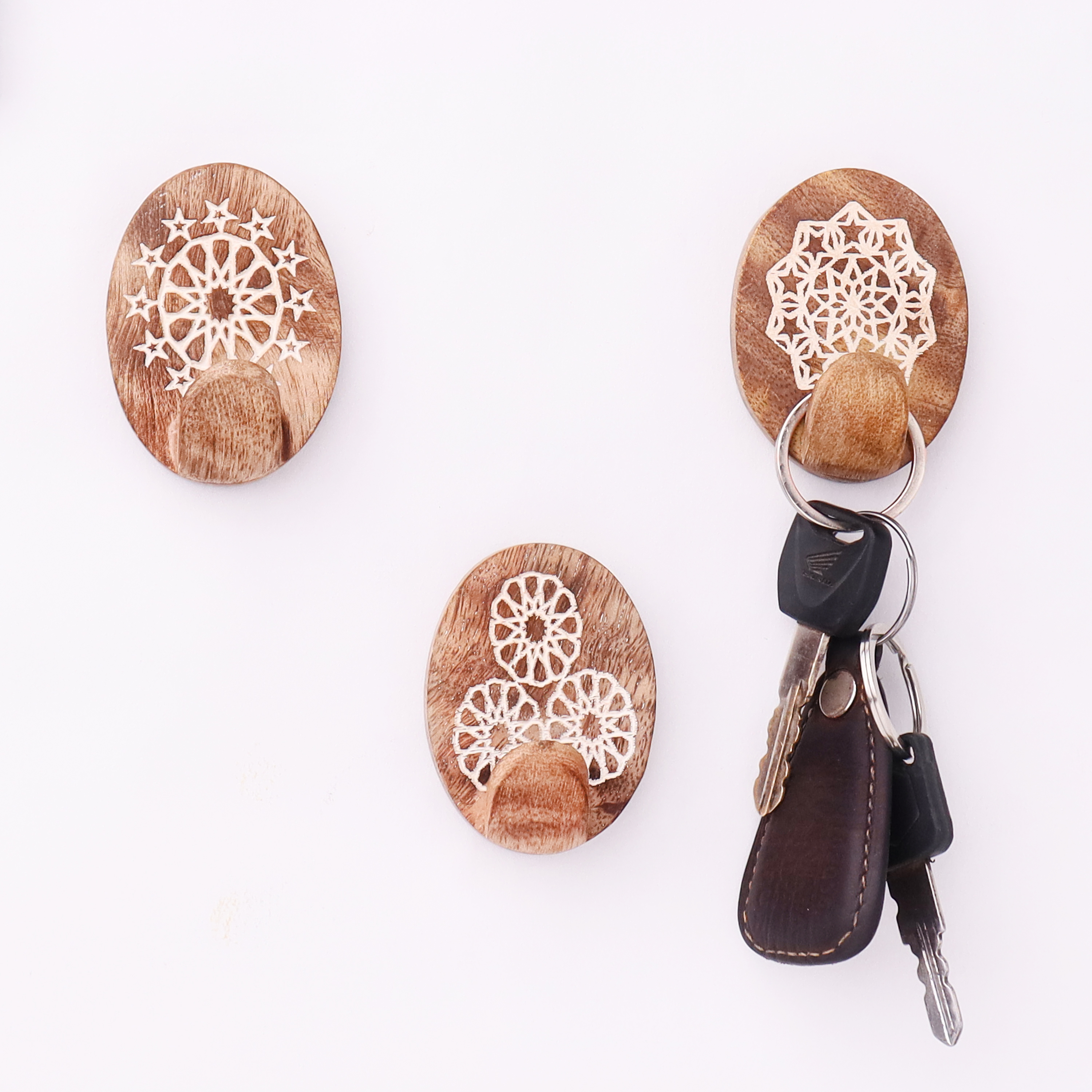 Handmade adhesive wooden wall hook is perfect for hanging towels, clothes, hats, bags, keys, scarves and jackets. It's very easy to mount on a wall or door.