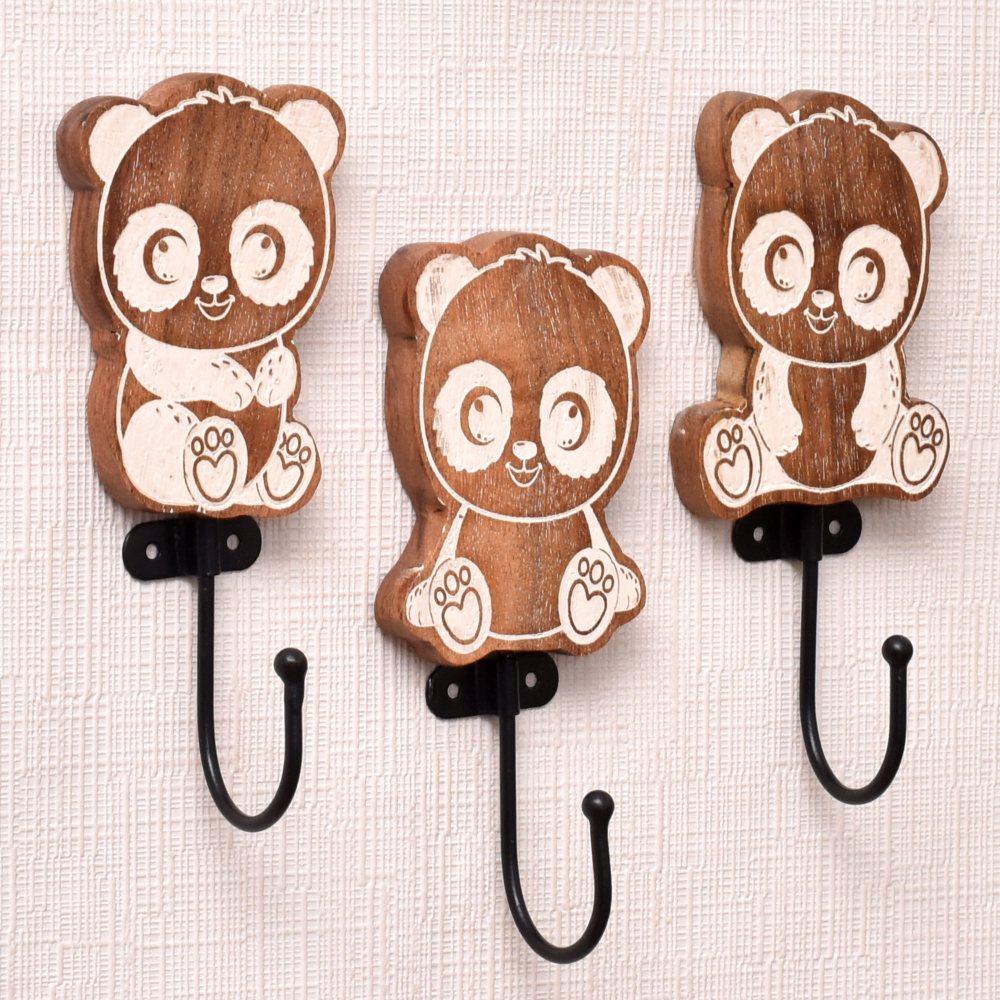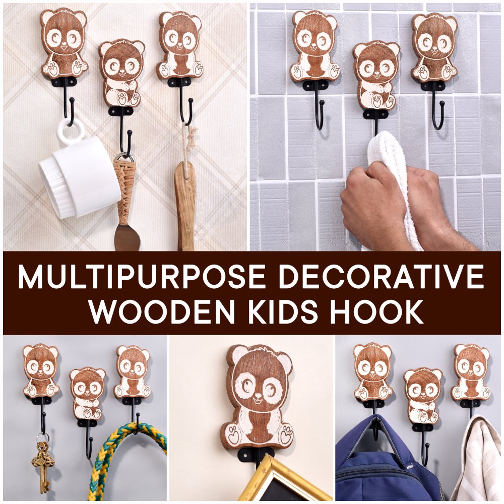 An Adorable Wooden Kids Hook Pack of 3 in a delightful brown colour. These hooks are designed in the shape of cute pandas, making them a charming addition to any kid’s room. Crafted with precision and care by highly skilled artisans from India, these hooks are made from high-quality wood, ensuring durability and long-lasting use. These versatile hooks serve multiple purposes, making them perfect for kid’s bathroom towel hooks, modern towel hooks, or coat hooks for kids. Hang towels, clothes, or bags effortlessly, keeping the space tidy and organized. Mounting these hooks on the wall is a breeze, thanks to their user-friendly design. Not only do these hooks serve a practical purpose, but they also add an aesthetic touch to the interior. With their delightful panda shape and rich brown colour, they effortlessly enhance the overall decor of the room. Transform your kid’s room into a captivating space with these incredible wooden hooks. Their unique design and exceptional quality make them an ideal choice for any young adventurer's abode.