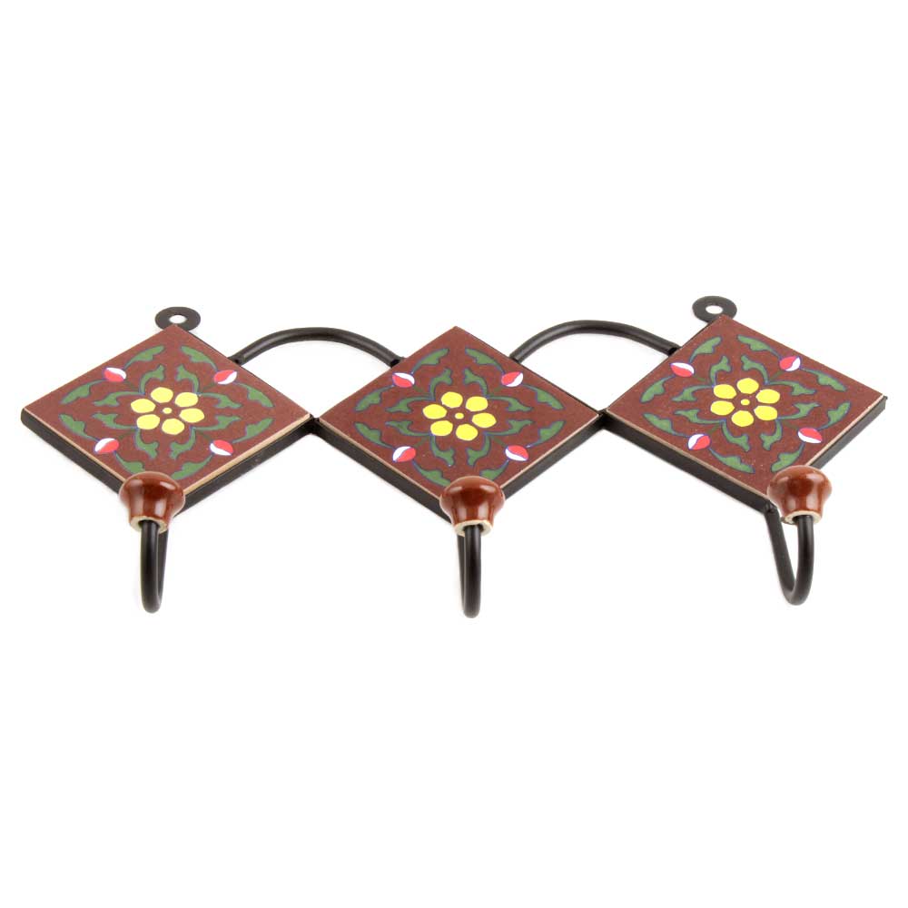 Brown Yellow Flower Tiles Hook. When Put on Wall or Cabinet It is An Art in Itself. the Metal Part of This Hook is Black Powder Coated.