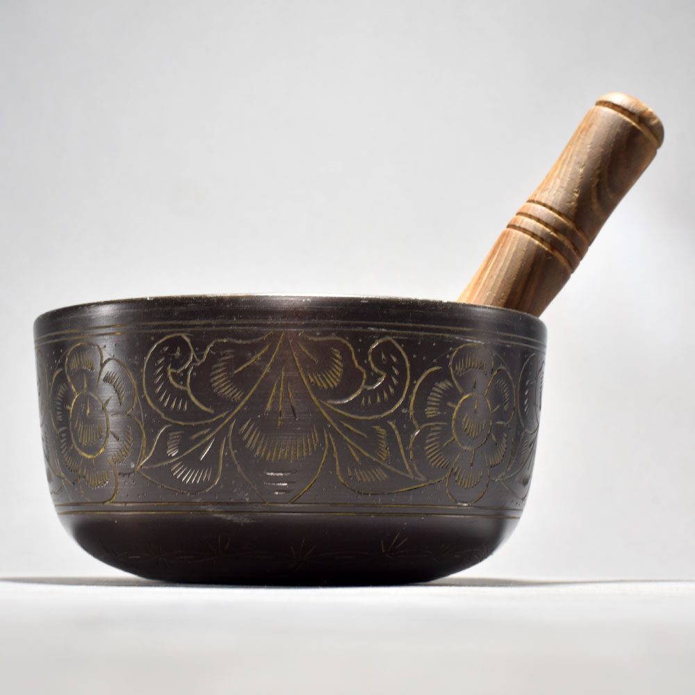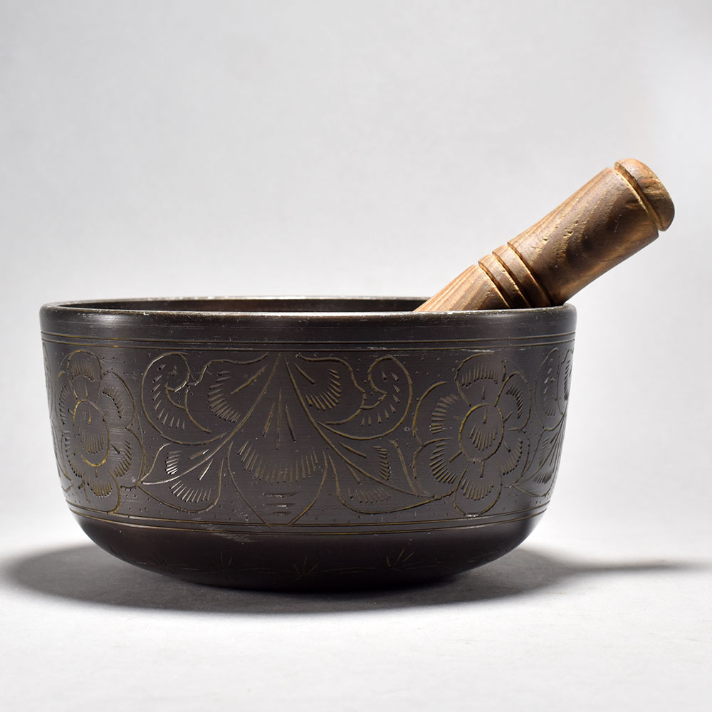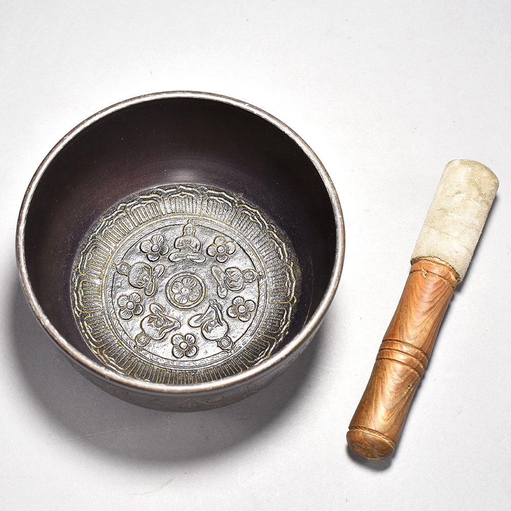 Discover the power of ancient Tibetan sound healing with this exquisite Buddha floral carved Singing Om bowl.Step into a world of tranquility and mindfulness with this captivating Tibetan singing bowl. Crafted with centuries-old techniques, this beautiful bowl is a gateway to inner peace and well-being. Whether you're an experienced meditator or simply seeking a moment of calm, this singing bowl will transform your space into a sanctuary of serenity. Elevate your wellness routine with this versatile Singing Om bowl. Its soothing vibrations create the ideal environment for deep relaxation, stress relief, and sound healing. Enhance your meditation practice, lull yourself to sleep, or simply bask in the bowl's calming tones - this essential tool will become an indispensable part of your journey to greater wellbeing. Meticulously crafted from premium metal with intricate floral and Buddha carvings Produces a rich, resonant tone that promotes deep relaxation and meditation Hand-painted designs and Tibetan mantras infuse the bowl with spiritual energy Includes a wooden striker for effortless sound therapy sessions
