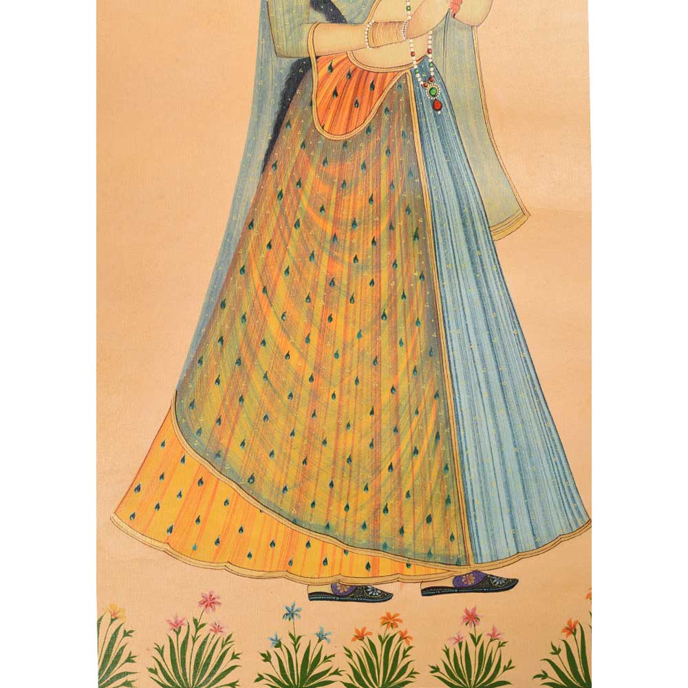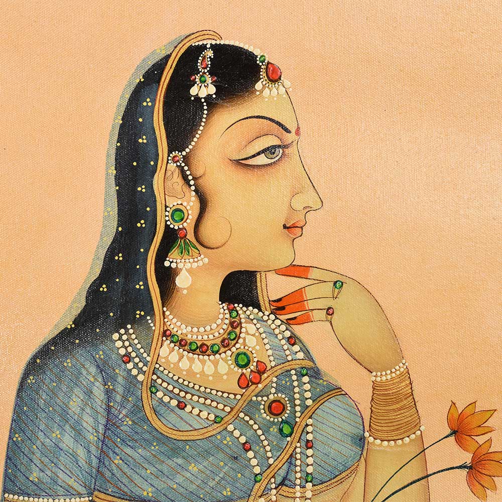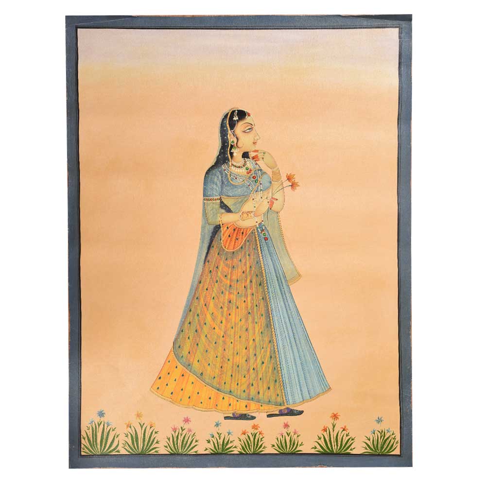 Canvas Mughal painting depicting a lady holding orange flowers looks amazing and will completely change the atmosphere of the room, office where It is placed.