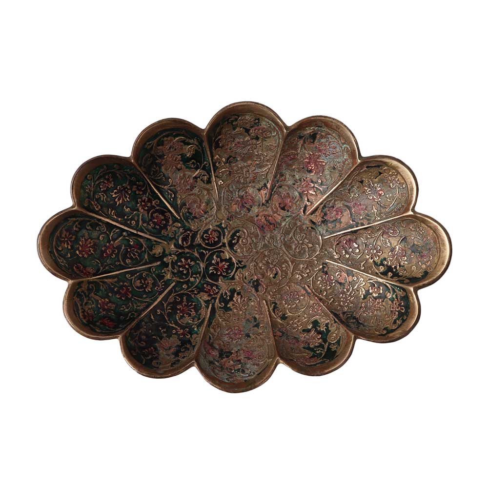 A carved brass fruit bowl with scallop edges is a decorative item for the home. It is typically made of brass, which is a metal alloy composed of copper and zinc. The brass bowl is carved and shaped into a fruit bowl with scalloped edges, giving it a decorative and ornate appearance. The scalloped edges add a touch of elegance and sophistication, making the bowl an attractive addition to a table or kitchen counter. The bowl can be used to hold fruit, snacks, or other food items, or it can be used simply for decoration. Brass is a durable material that can be polished to a shine, adding to the beauty of the bowl.