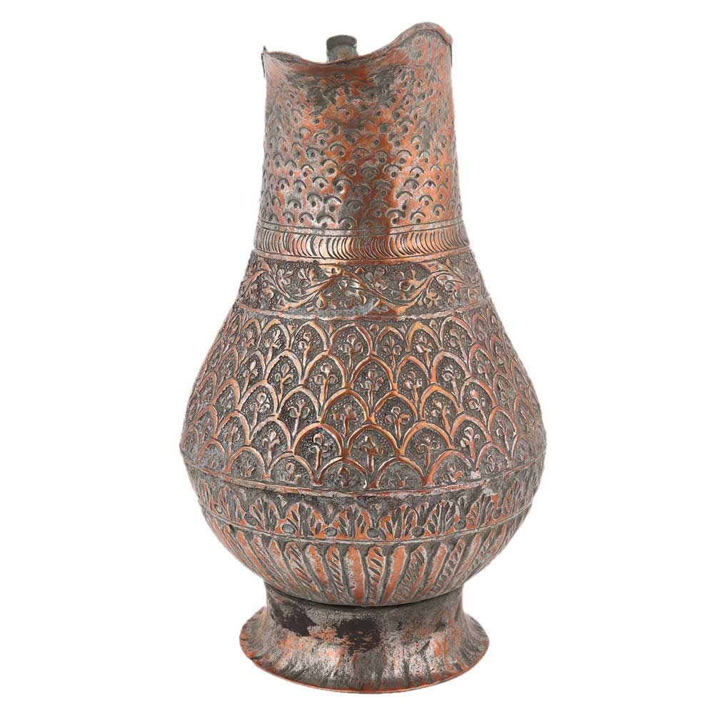 Traditionally hand carved copper jug in Islamic style with leaves motifs all over resting on a circular base .Ideal collectors choice and gift for your near and dear ones.