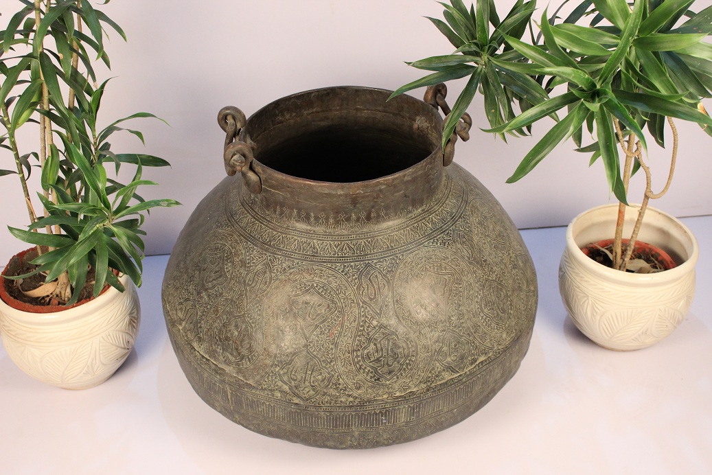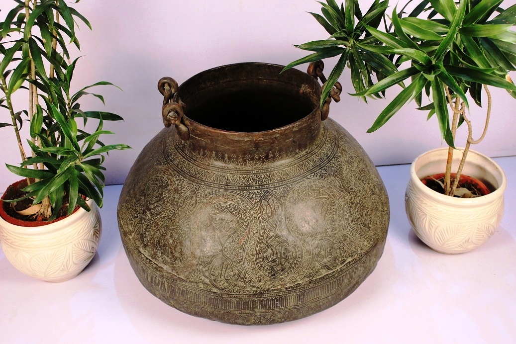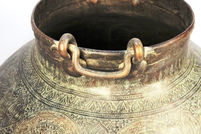 Vintage Copper Planter with ring handles . It is Handmade by Skilled Indian Craftsmen.It has lovely hand carved design of flowers and leaves all over the surface of the planter . The upper portion of the planter has ring handles for lifting. It comes with a natural patina