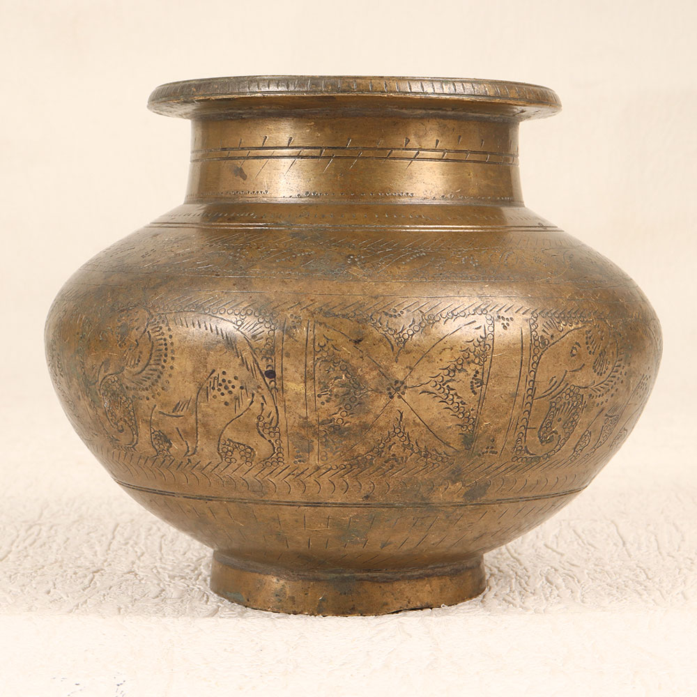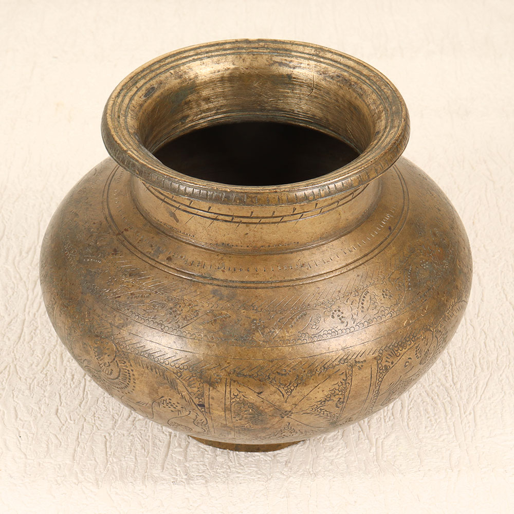 Immerse yourself in old-world charm with this handcrafted vintage brass holy water pot from India. Its ornate carved details and rich patina finish create an exotic focal point for any space. This handcrafted brass pot transports you to ancient times with its exotic styling. Place it in an entryway or living room to hold holy water for a blessing as you come and go. Or display it as an artistic accent piece that steals attention. The vintage design and ornate Indian craftsmanship make it a wonderful gift for yogis, spiritual seekers, and world travelers looking to add global flair. With its rich patina finish and carved details, this pot brings an intriguing, old-world vibe to any space.