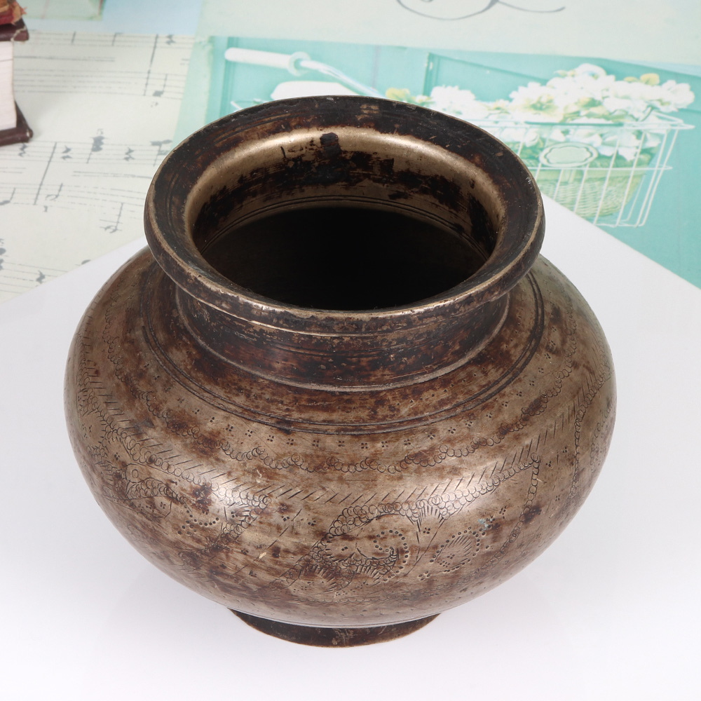 Ritual has the power to transform, to elevate the mundane into the sacred. Elevate your rituals with the timeless beauty and spiritual essence of this exquisite brass holy water pot, meticulously crafted by skilled artisans in the cultural heartland of Gujarat, India. Meanwhile, the intricate carvings adorning the exterior lend an air of reverence and ancient wisdom to your spiritual practice. Durable yet elegant, this brass pot will become an indispensable tool in your journey of self-discovery and connection to the divine. Whether you're a devoted practitioner seeking to deepen your spiritual practice, or a lover of fine home decor looking to infuse your space with cultural richness, this vintage brass holy water pot is a must-have addition to your collection. Embrace the transformative power of ritual and let this sacred vessel become an integral part of your mindful, intentional lifestyle.