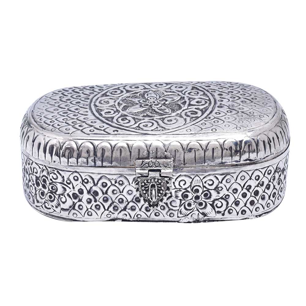 Both men and women can benefit from wearing jewelry, and it is important to keep it secure. Put your priceless jewelry in this white, handcrafted jewelry box with german silver plating. This box, which features a peacock top, will look fantastic on your dresser. A Vintage Metal Jewelry Box Trinket Storage Organizer is a decorative and functional item that is used for storing and organizing jewelry and small trinkets. The box is typically made of metal, either brass or steel, and features intricate designs and details that reflect the vintage aesthetic. The metal material provides durability and protection for the contents of the box, making it a practical storage solution. The vintage design and aesthetic of the jewelry box make it a popular choice for collectors of vintage items and those who appreciate the beauty of antique design. With proper care, a vintage metal jewelry box trinket storage organizer can last for many years and become a cherished family heirloom.