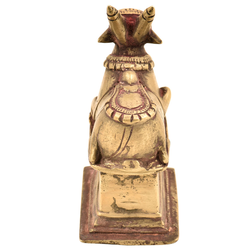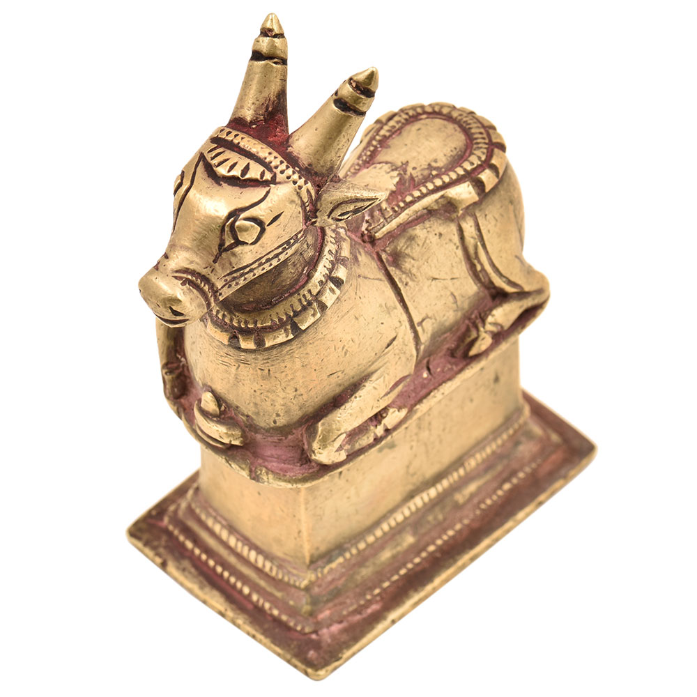 This brass Nandi statue is perfect for you to keep by the side of your idol of Lord Shiva kneeling in reverence and worship waiting to serve his Lord Shiva . It looks mesmerizing for the detailing on it and its brass make. The golden color looks shimmery on it. The size is just right for you to keep it in your spot of worshipping.