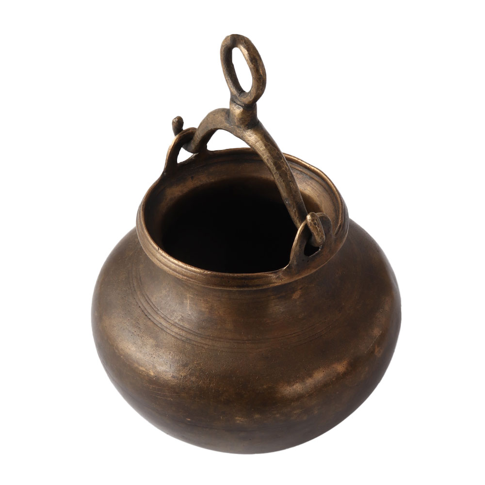 A stunning cauldron with rings for hooking onto a hook, presumably above an open fire, fashioned of thick, hand-shaped brass and forged iron. Would look amazing with plants, even without a drain hole, or a stunning bouquet of dried flowers. Brass rivets are used to attach the pot's wrought iron handles. Has wear, including scratches, tarnish, dents in the brass, and some dirt that appears to have been baked into the metal by the sun. All of which improves the retro appearance and atmosphere.